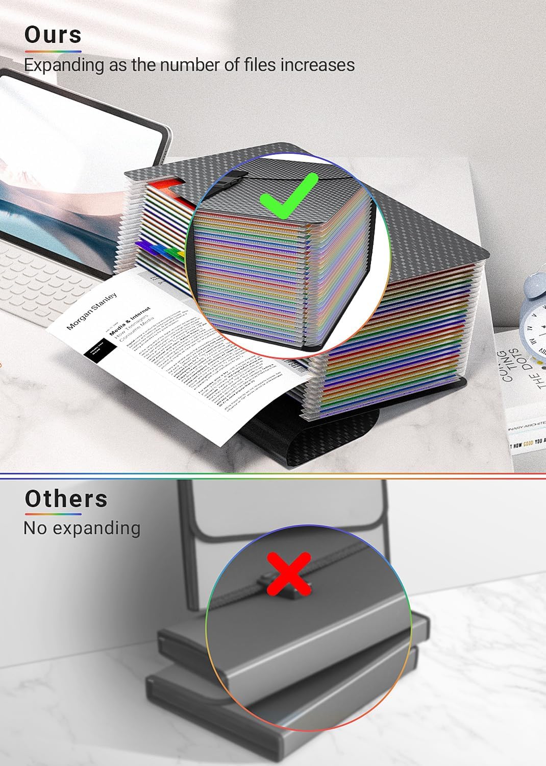 - ✔【EXPANDABLE】The lid of file folder organizer is designed with an extension line,The interior of file folders can be fully expanded and adjusted to the perfect position at will as more and more documents are put in. It's definitely a useful and fashionable expanding file folders.