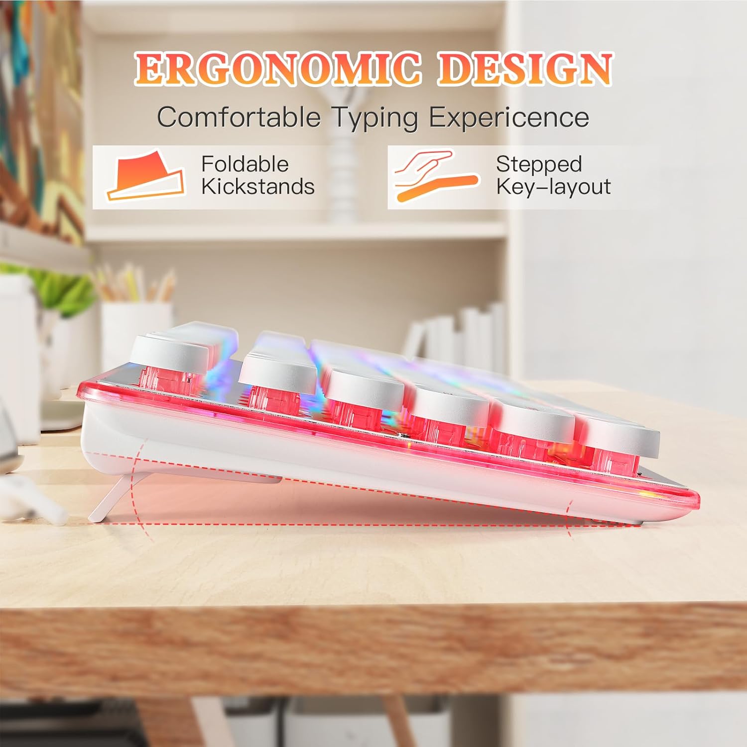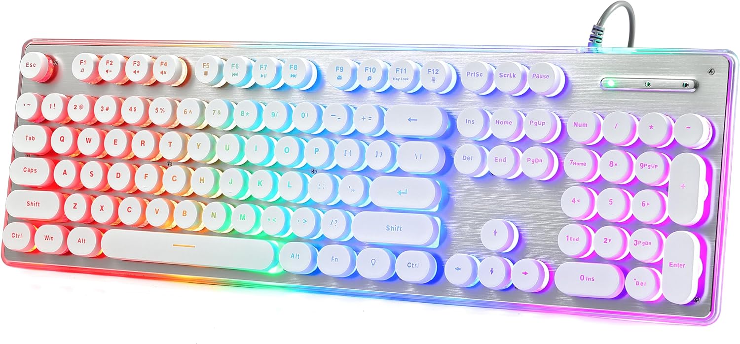 Typewriter Style Keyboard with Metal Panel, Rainbow LED Backlit, Round Keys, Anti-ghosting, Spill Resistant, Light Up USB Wired Retro 104 Keys for Office/Gaming, White/Silver