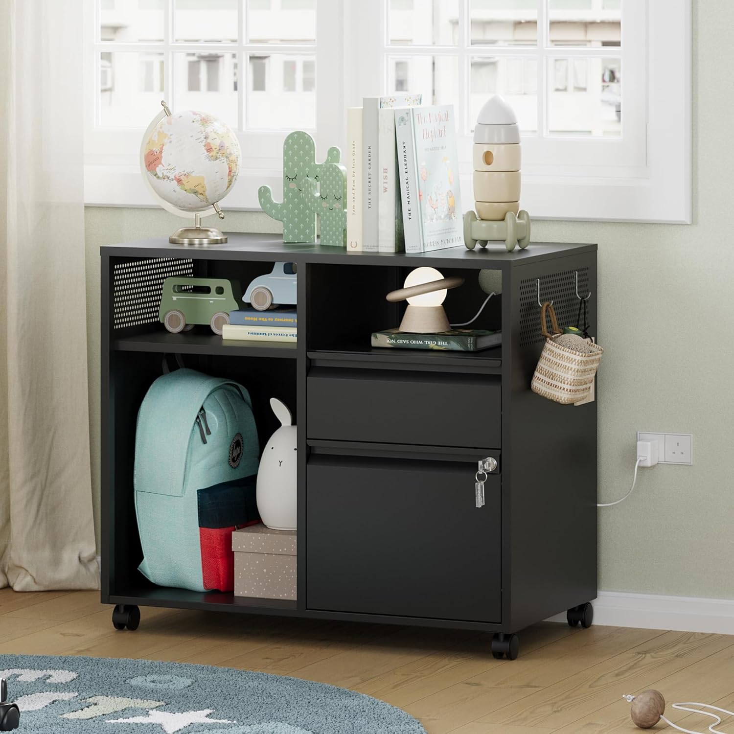 - ăMultifunctional Filing CabinetăLateral filing cabinet with open storage spaces, organization and storage drawers,holds printer stand and office craft storage,side hole panel design is beautiful and can hang items,modern delicate appearance ornamental to your office & home.
