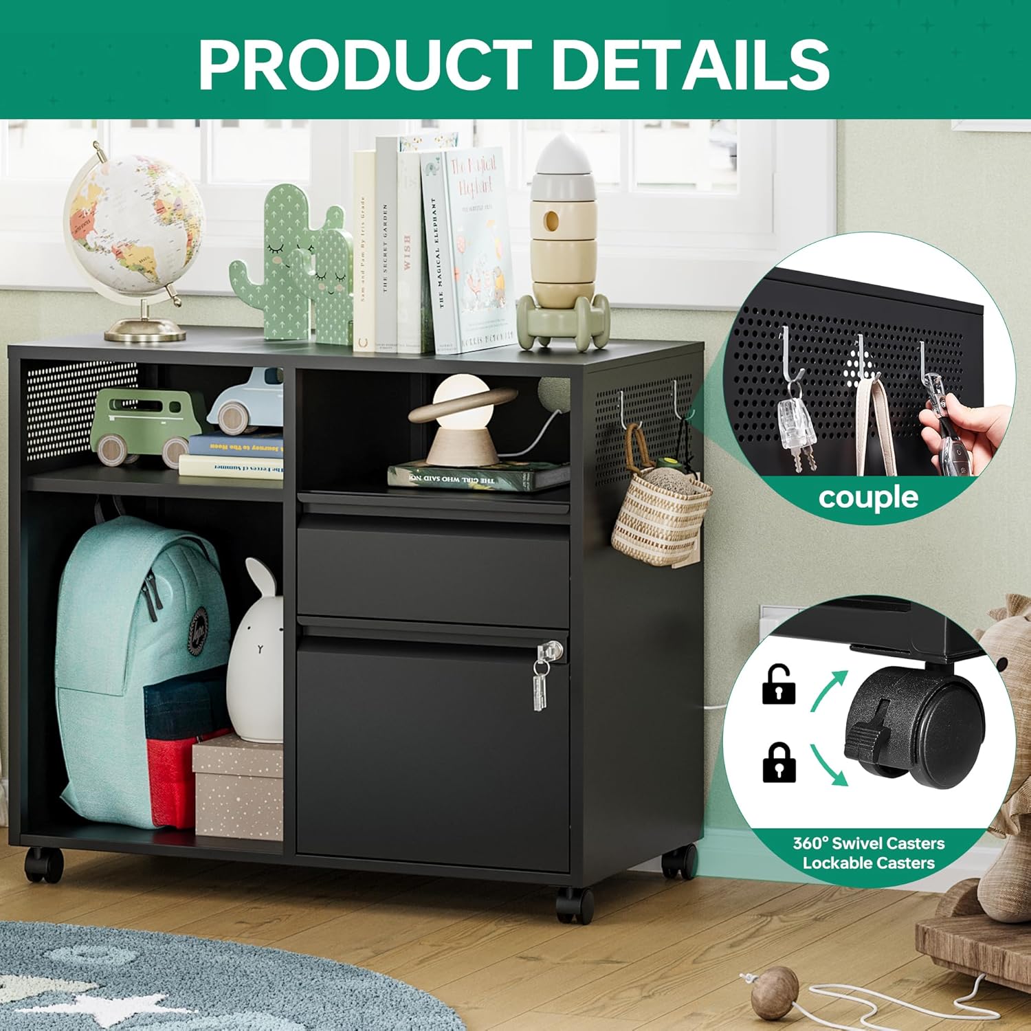 - ăEasy to moveă4 removable wheels- printer stand can be moved and adjusted in position freely,2 wheels lockable to keep cabinet stableïŒDrawer with lock ensure the safety of items.
