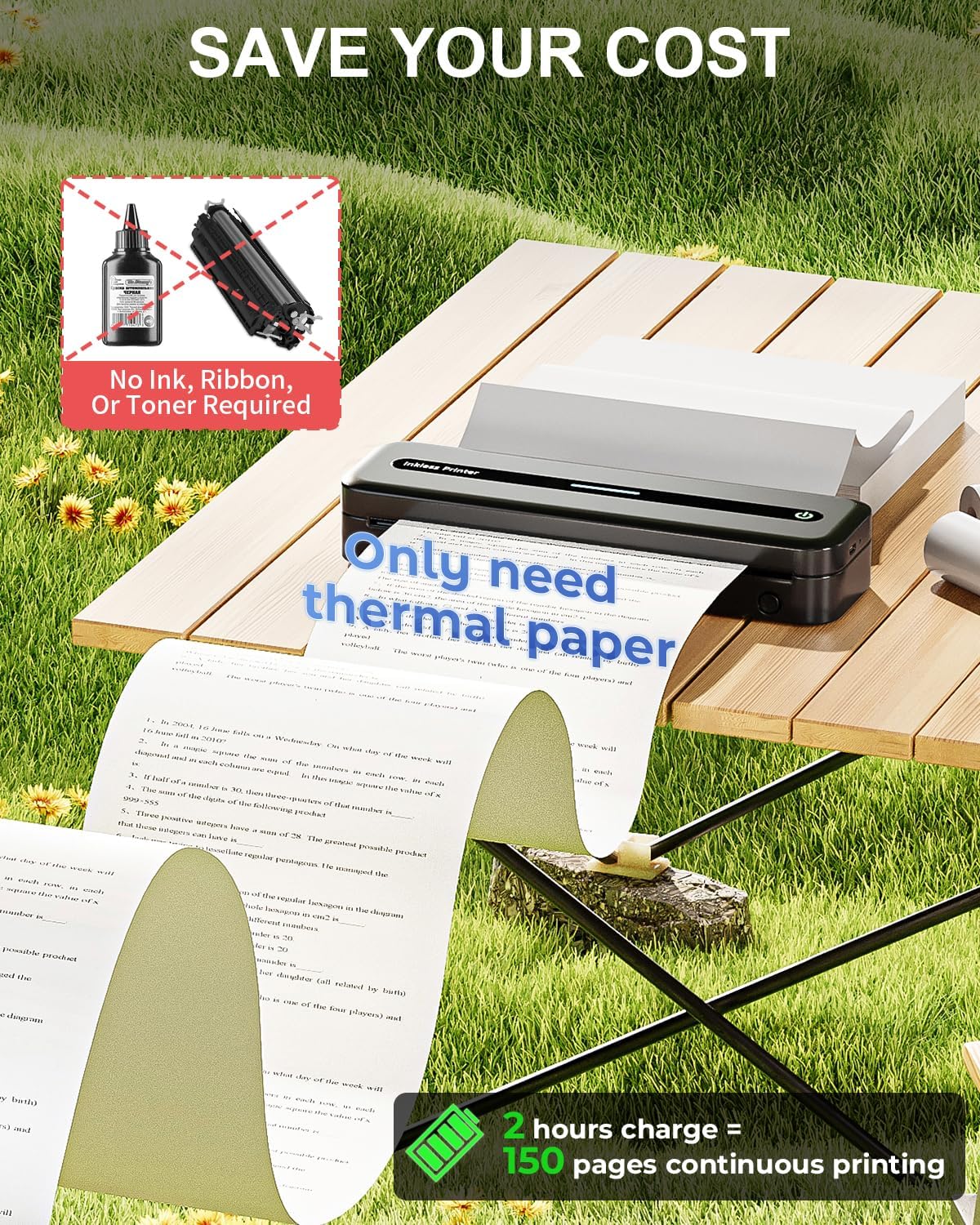 - SAVE YOUR COST AND TIME: COLORWING no ink printer donβt need ink, ribbon or toner $0 costing, only $0.14 thermal paper. More cleaner and more convenient, and does not jeopardize your human health. Small printer with large capacity, charging for 2 hours can print 300 sheets continuously.