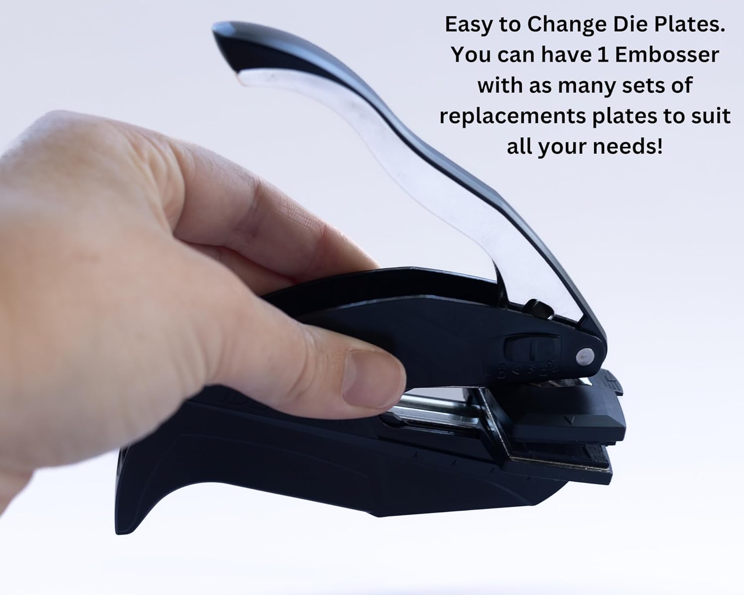 - Easy to use: Simply position your document or material on the embosser and press down with the handle to create your imprint