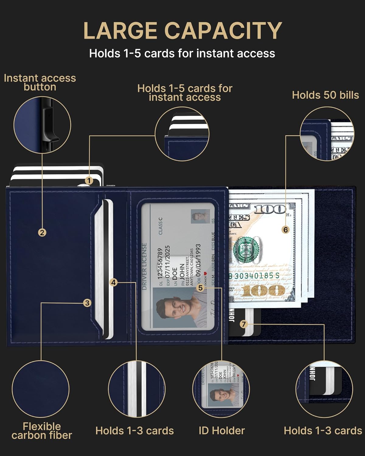 - 【QUICKEST ACCESS】Instant card access at the tap of a button by a single hand. Stores 10-15 cards and 15 bills total. The pop-up aluminum card holder stores 6-7, the built-in cash slot stores 50+ bills, and the ID window for driver's licenses.