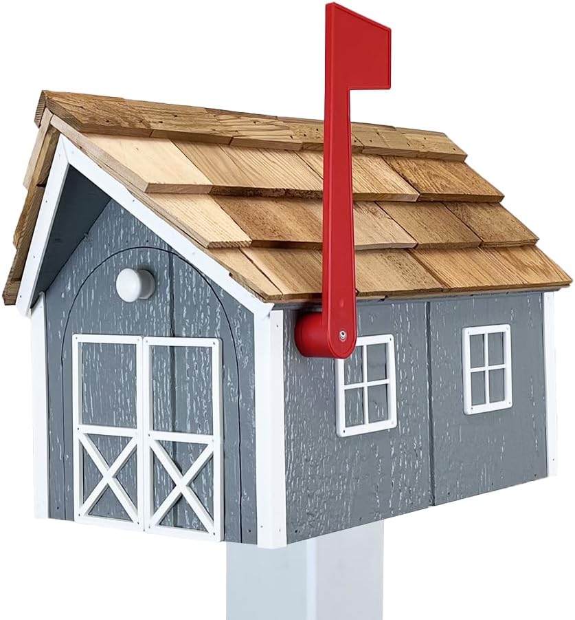 Peaceful Classics Amish Cedar Roof Wooden Mailbox with Window & Door Trim, Handcrafted Mailboxes for Outside, Post Mount Residential Mailboxes - (Gray & White, Wood)
