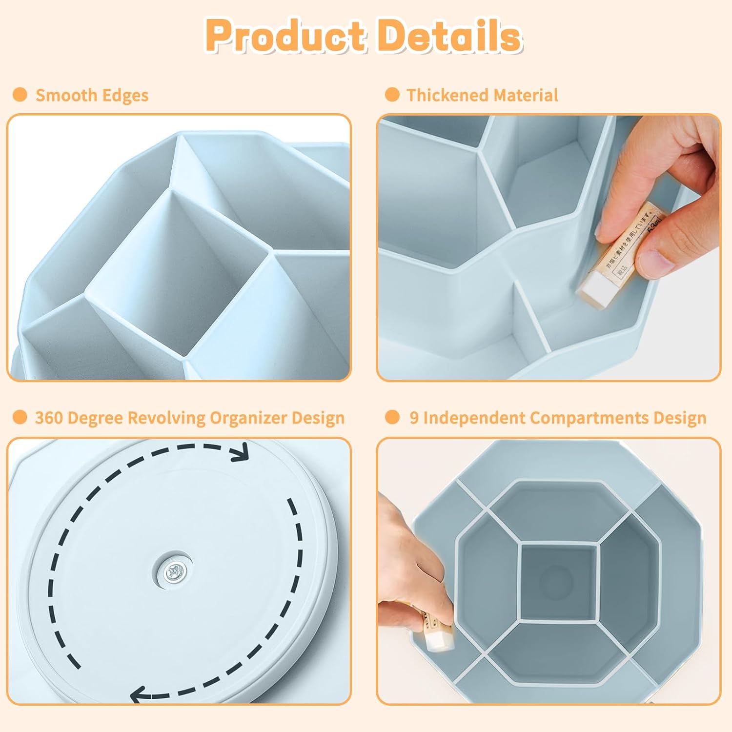- ăPerfect design & large capacityăThis desktop organizer features a diamond-faced design with 9 high-capacity individual compartments to meet your every need. This turntable pencil holder for your desk is not only perfect for storing your desktop stationery such as pens, pencils, markers, highlighters, rulers, staplers, flash drivers, erasers, paper clips, scissors, letter openers, and many other desk widgets but also great for storing your makeup brushes, nail polishes, lipsticks, and other small personal items