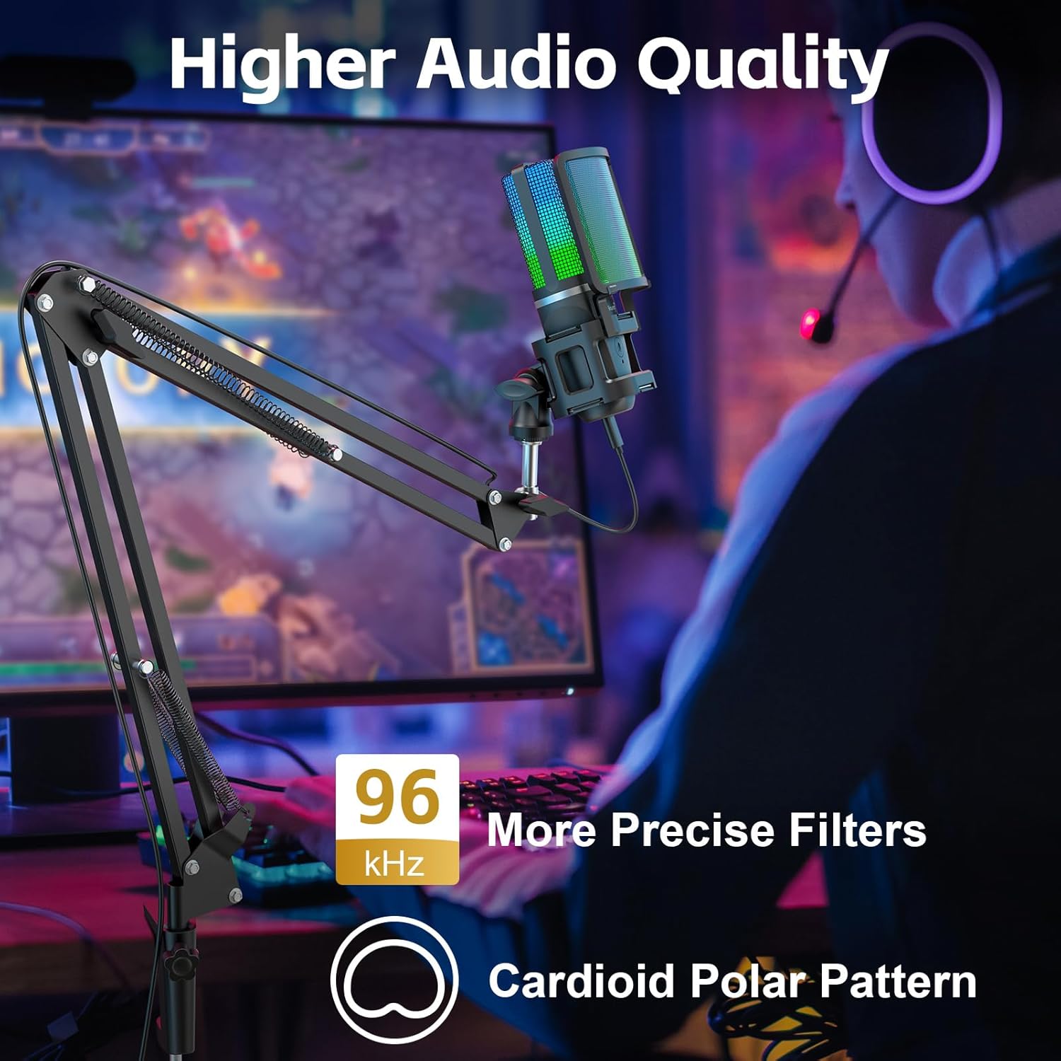 - ăHigh-Fidelity CaptureăUnleashing the Power of the 96kHz Microphone. This 96kHz RGB USB microphone for phone captures every nuance of your voice, ensuring superior sound quality. Its Cardioid pickup pattern adeptly eliminates background noise. The addition of a shock mount and detachable pop filter enhances your recording sessions, elevating them to sonic excellence. The collapsible mic tripod stand is now extended and enlarged, offering increased stability on your gaming desk, minimizing vibrations for an enhanced recording experience.