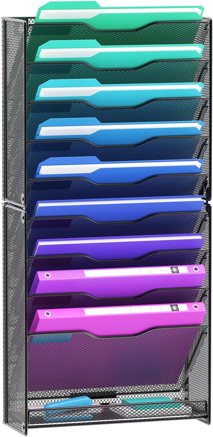 - 10-TIER WALL ORGANIZER: Hanging file organizer(15"L x 12"W x 2"H) has 10 vertical storage pockets and one storage tray at the bottom, which can be used to sort and store letters, papers, magazines files, etc. to meet different storage needs.