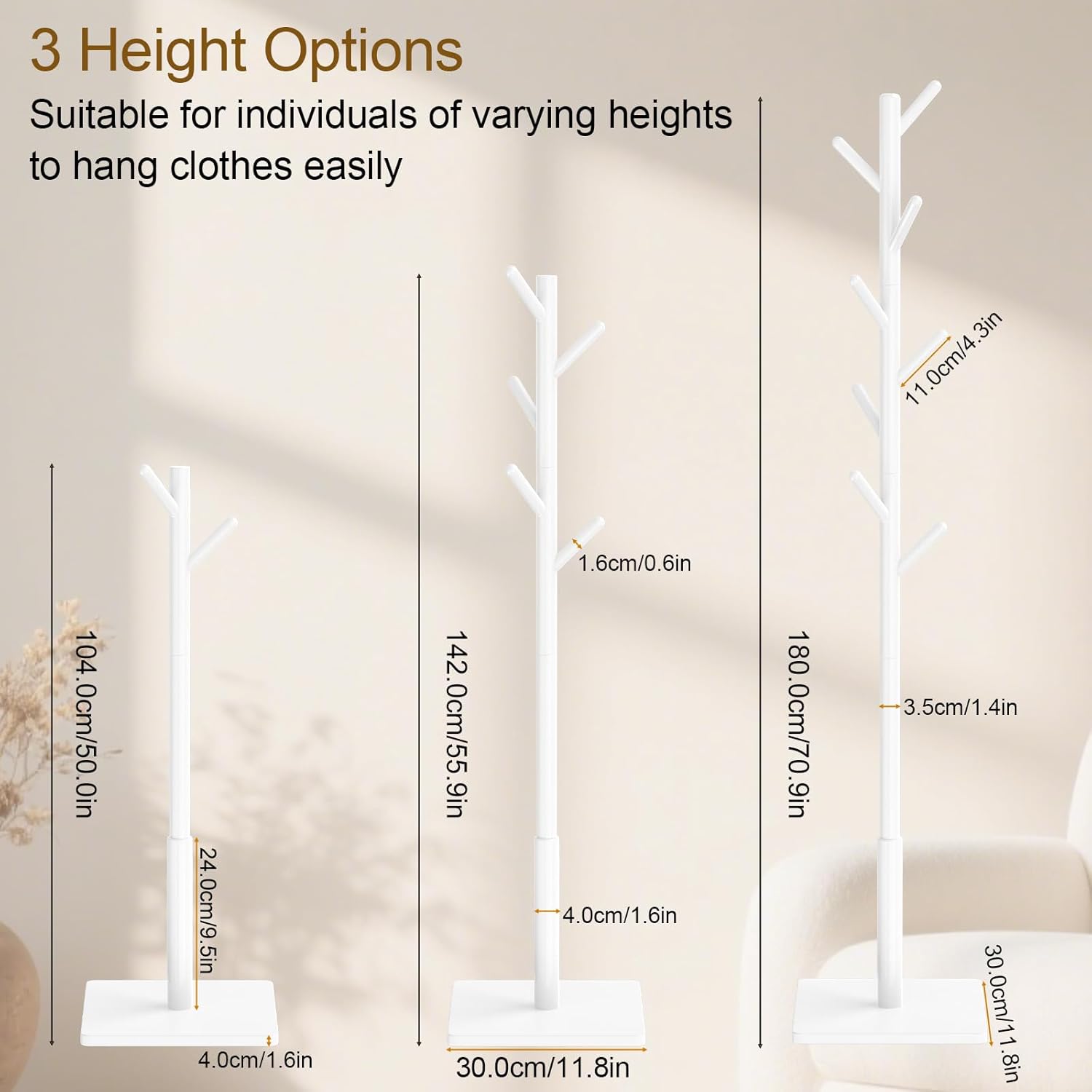 Coat Rack Freestanding with Stable Square Base for Cloathes, Hat, Used in Bedroom, Office and Entryway, Sturdy and Easy Assembly Coat Tree with 3 Adjustable Sizes and 8 Hooks, White