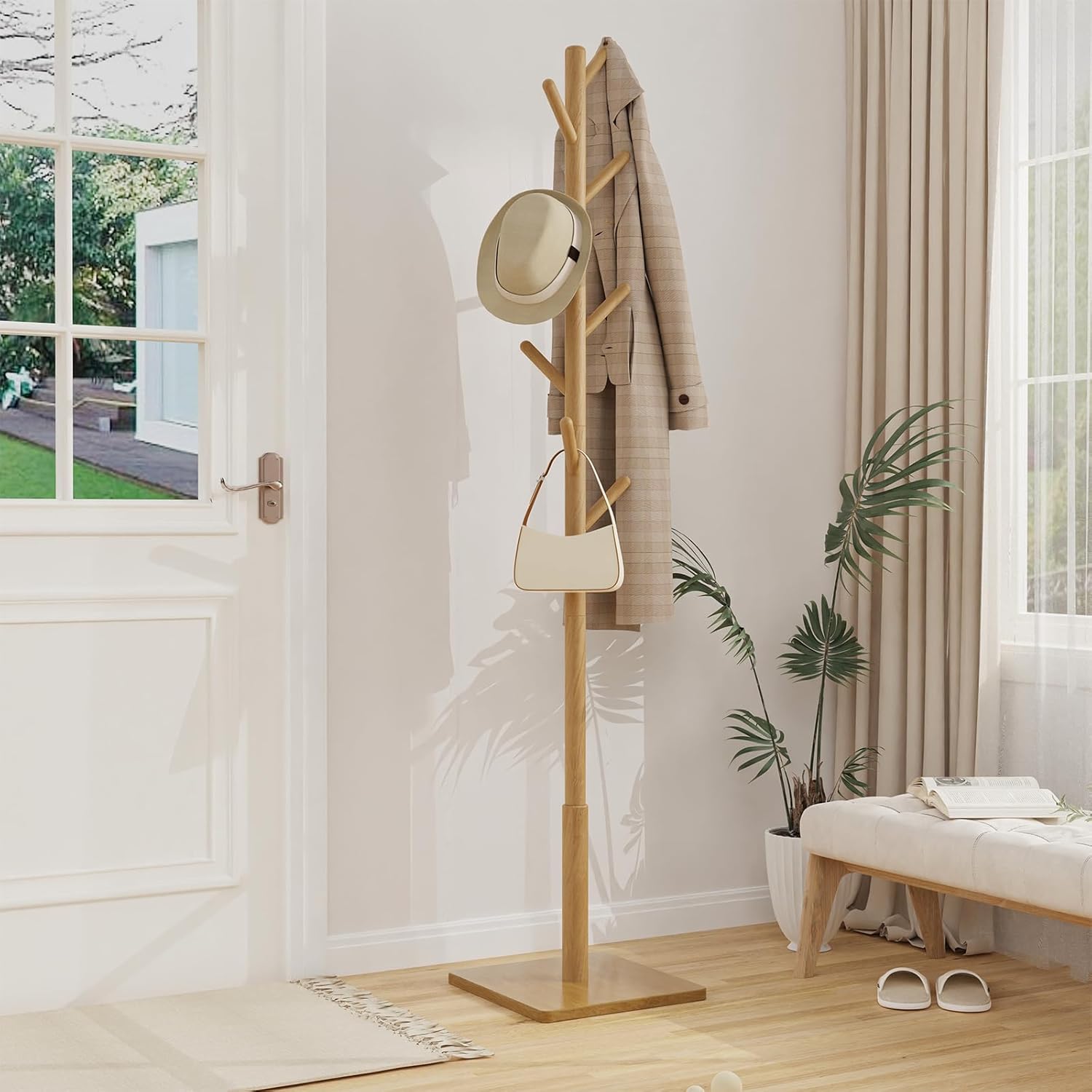 Coat Rack Freestanding with Stable Square Base for Cloathes, Hat, Used in Bedroom, Office and Entryway, Sturdy and Easy Assembly Coat Tree with 3 Adjustable Sizes and 8 Hooks, Natural