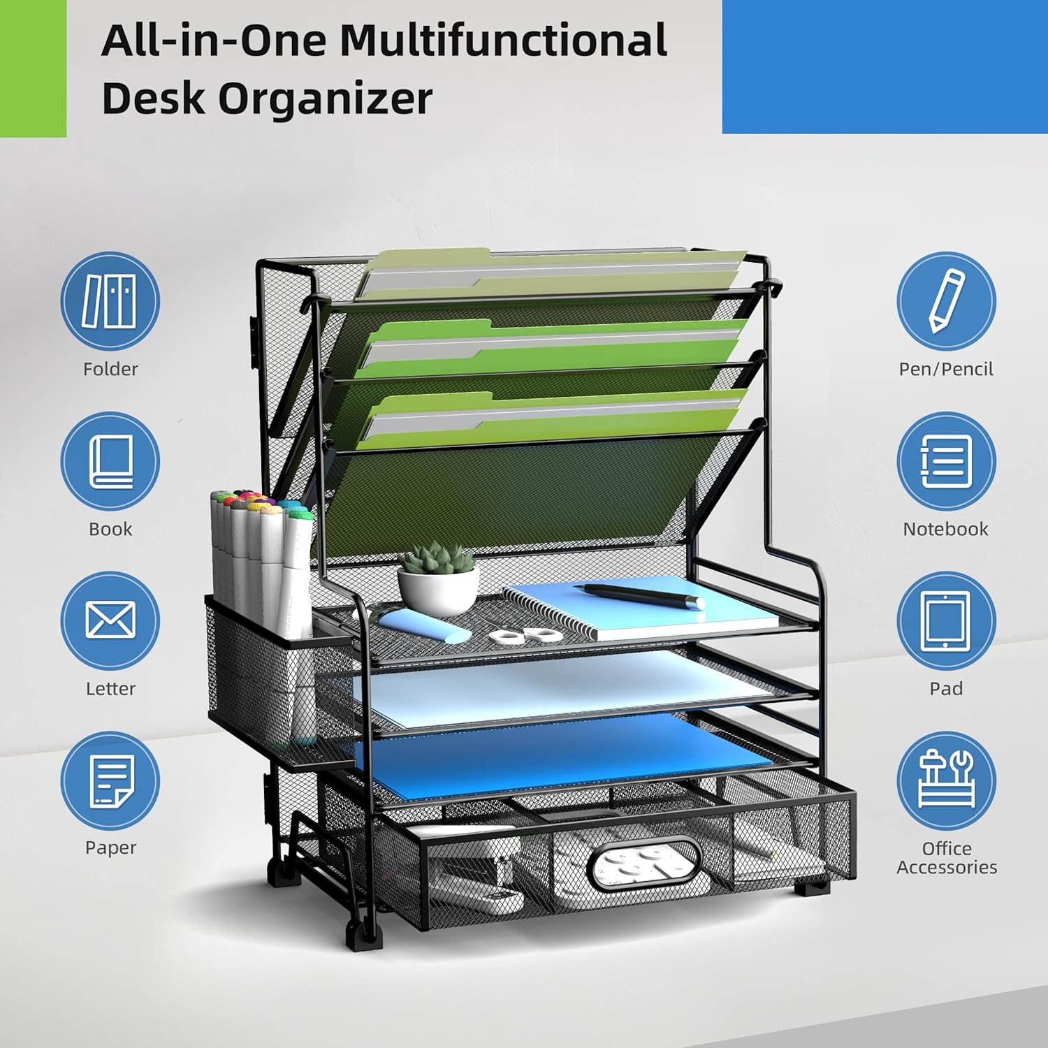 4-Tier Paper Organizer + 3-Pocket File Holder + Drawer + Pen Holders, Desktop File Organizers Paper Tray for Office Accessories School Classroom Organization (Black)
