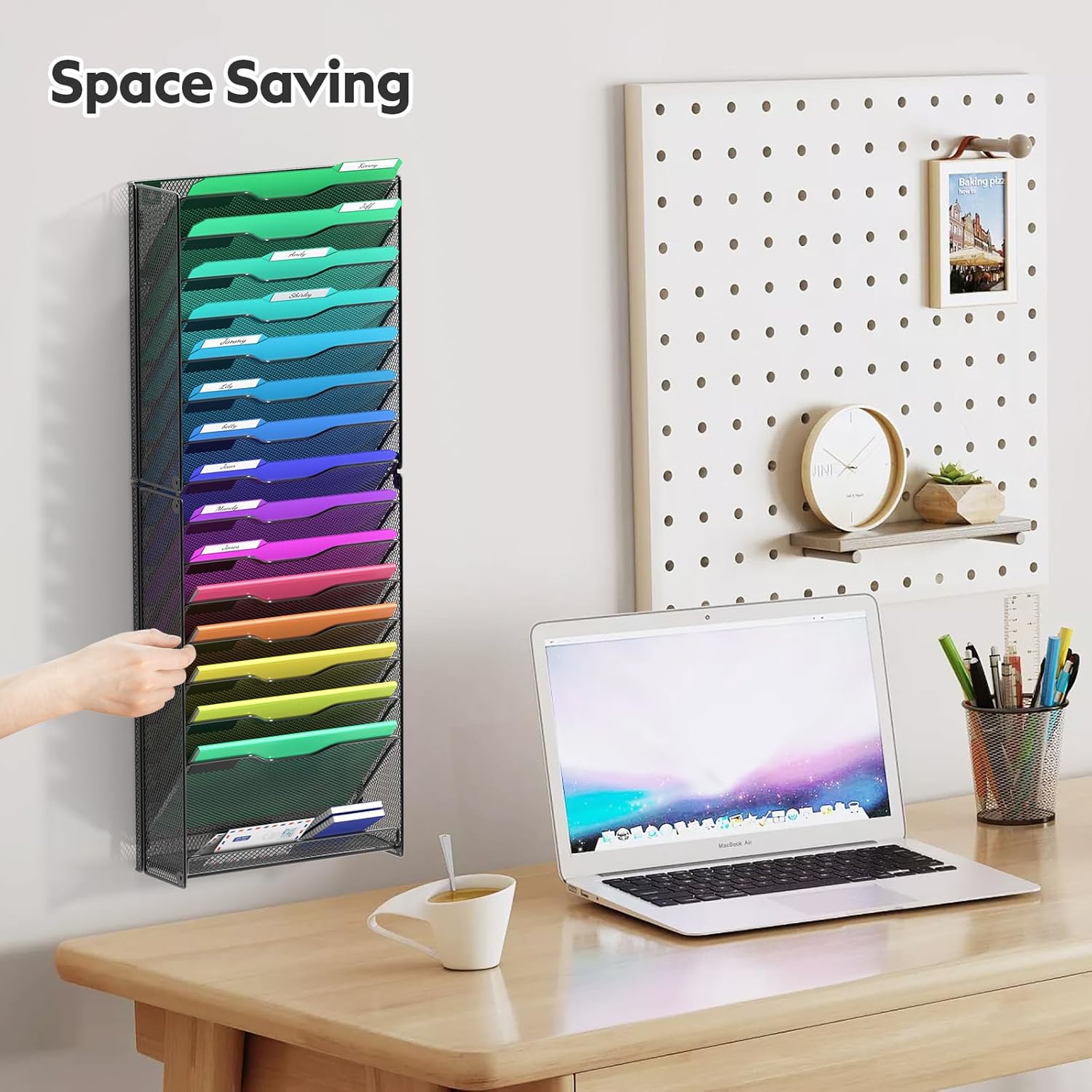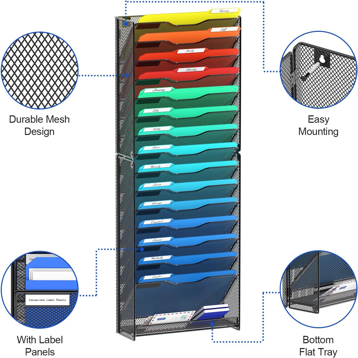 - Super Large Wall Organizer: 16 tier shelves allows you filling all different types of papers, letters, mails, clipboard, magazines ,file folders, documents etc. Bottom Flat tray can storage your other desk accessories.