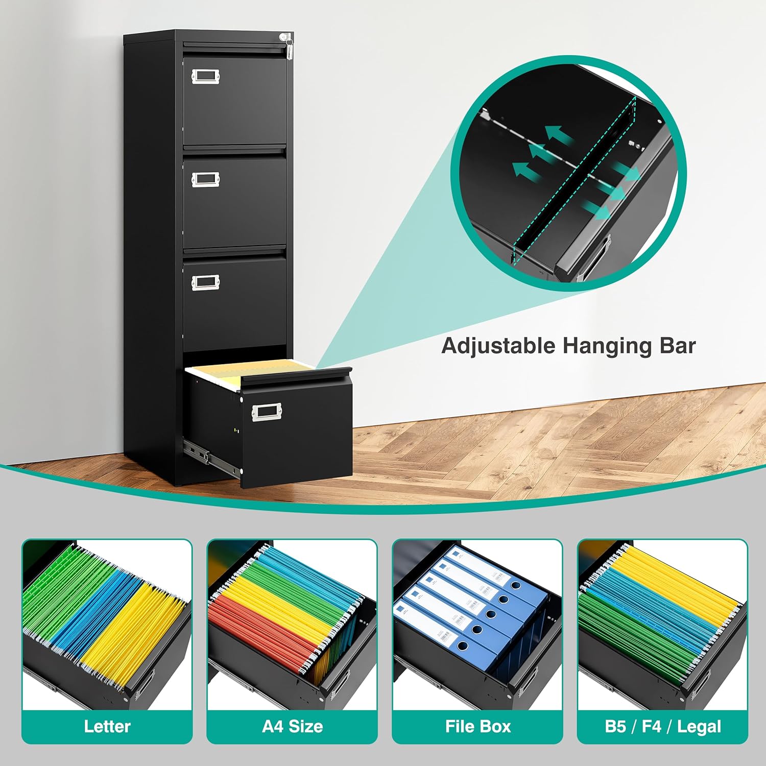 - AMPLE STORAGE: Office file cabinets equipped with removable hanging bar, providing enough space to supports letter size, legal size,A4 size file in all drawers.