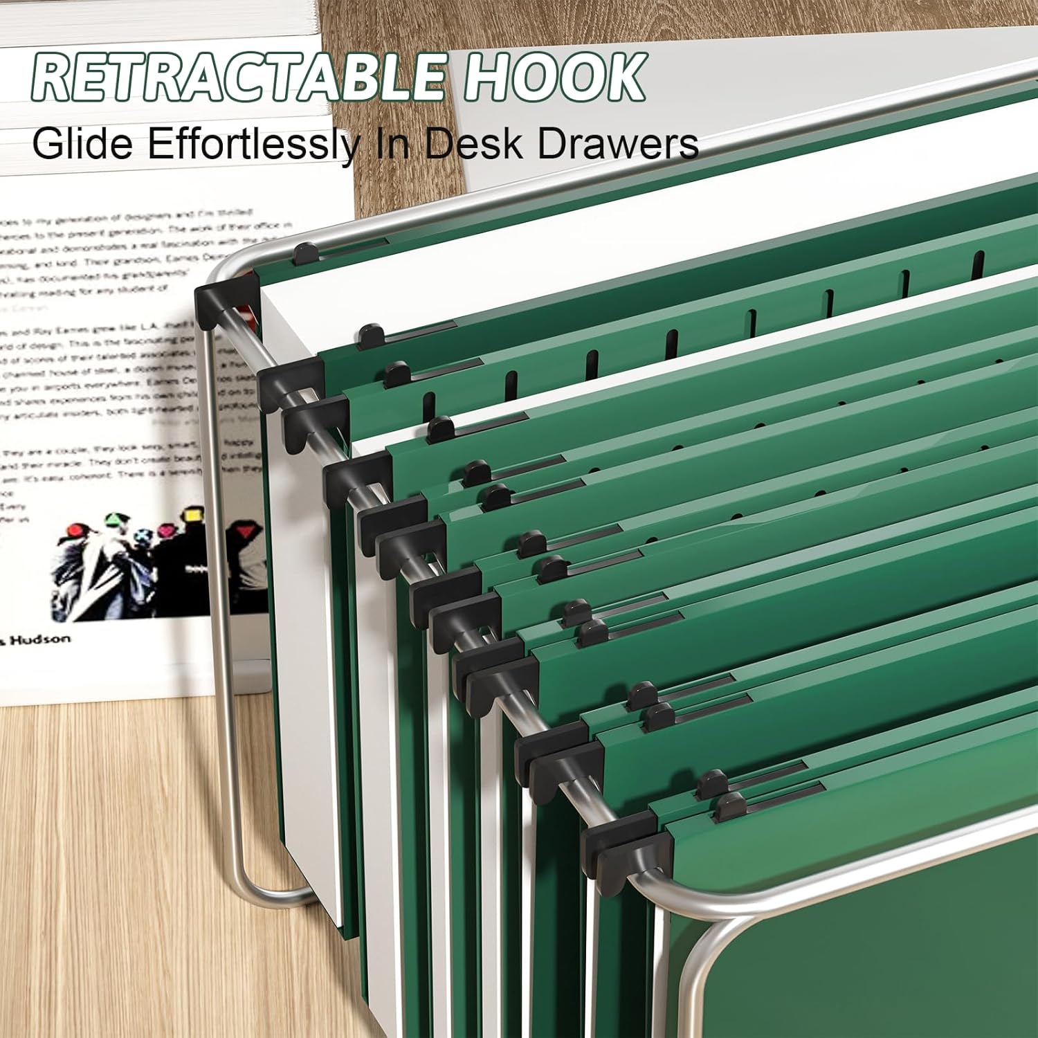 - 【Retractable Hook】:The hanging file folders adopts thickened and durable telescoping slides glide effortlessly in desk drawers、file cabinets, and file boxes.Durable telescopic hooks can bear heavy documents for a long time without deformation.