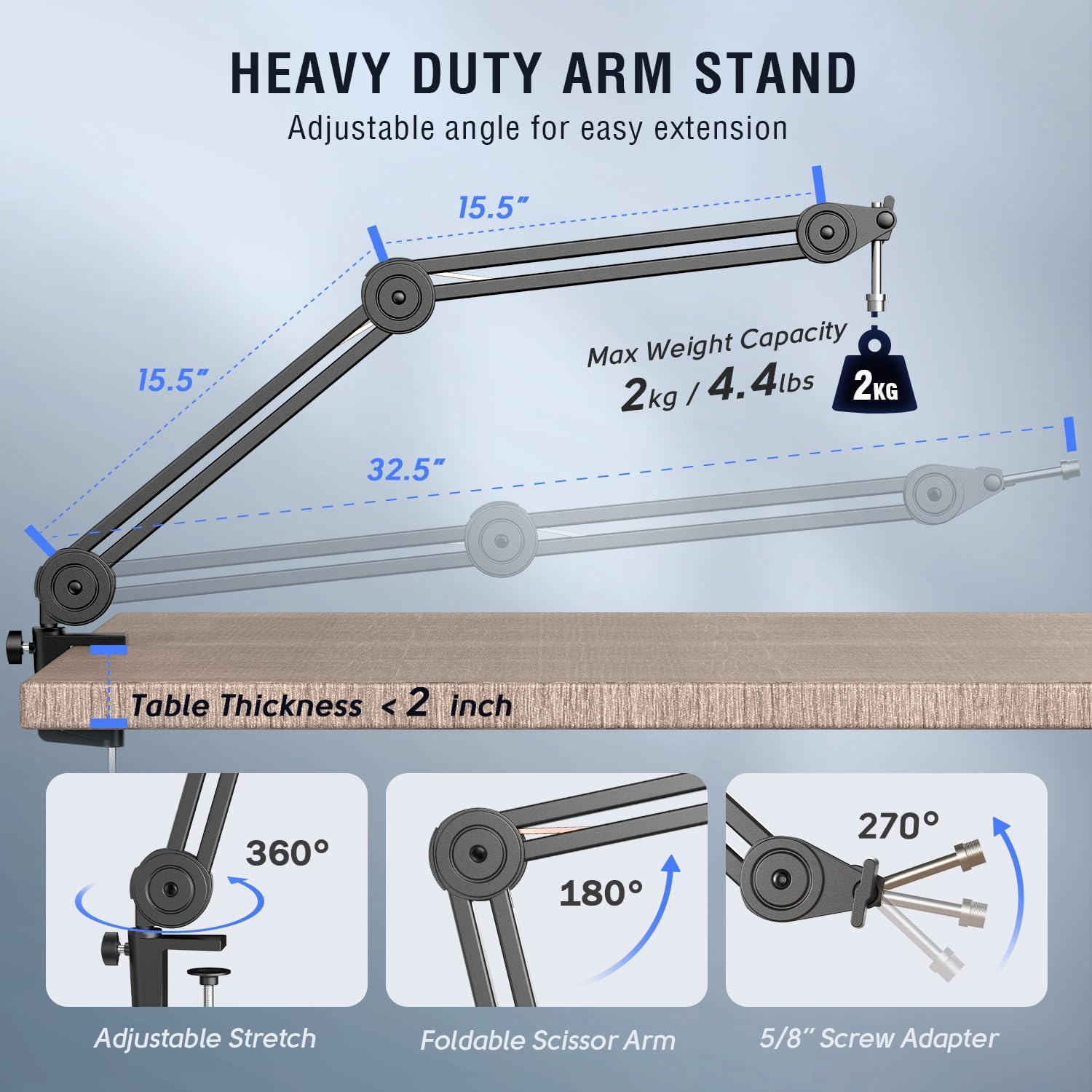 - [Boom Arm Microphone] Made of sturdy metal, the suspension boom arm mic stand enables to bear a weight of up to 2 kilogram, which securely holds your XLR dynamic microphone to reduce collisions and vibrations during podcasts or streaming. You can stretch the boom arm streaming microphone vertically for 180° or horizontally for 135° to achieve flexible adjustment and extension for more engaging and resonant audio.