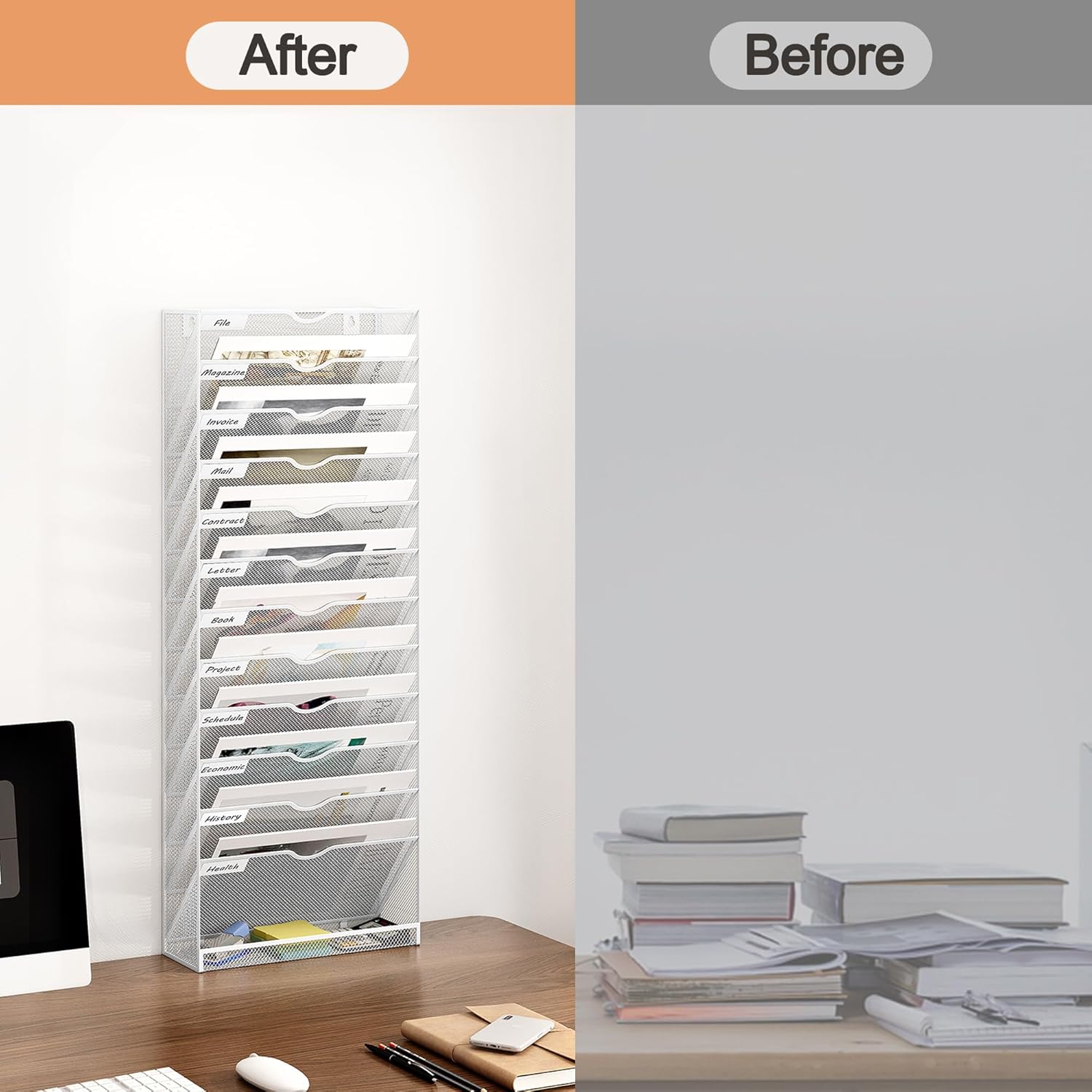 - Durable: The Mail organizer wall mounted is made of durable metal with a coating that extends the life of the wall mount. The metal mesh construction reduces weight while keeping air circulating through the wall paper organizer, so you don't have to worry about mold and mildew on your documents or papers