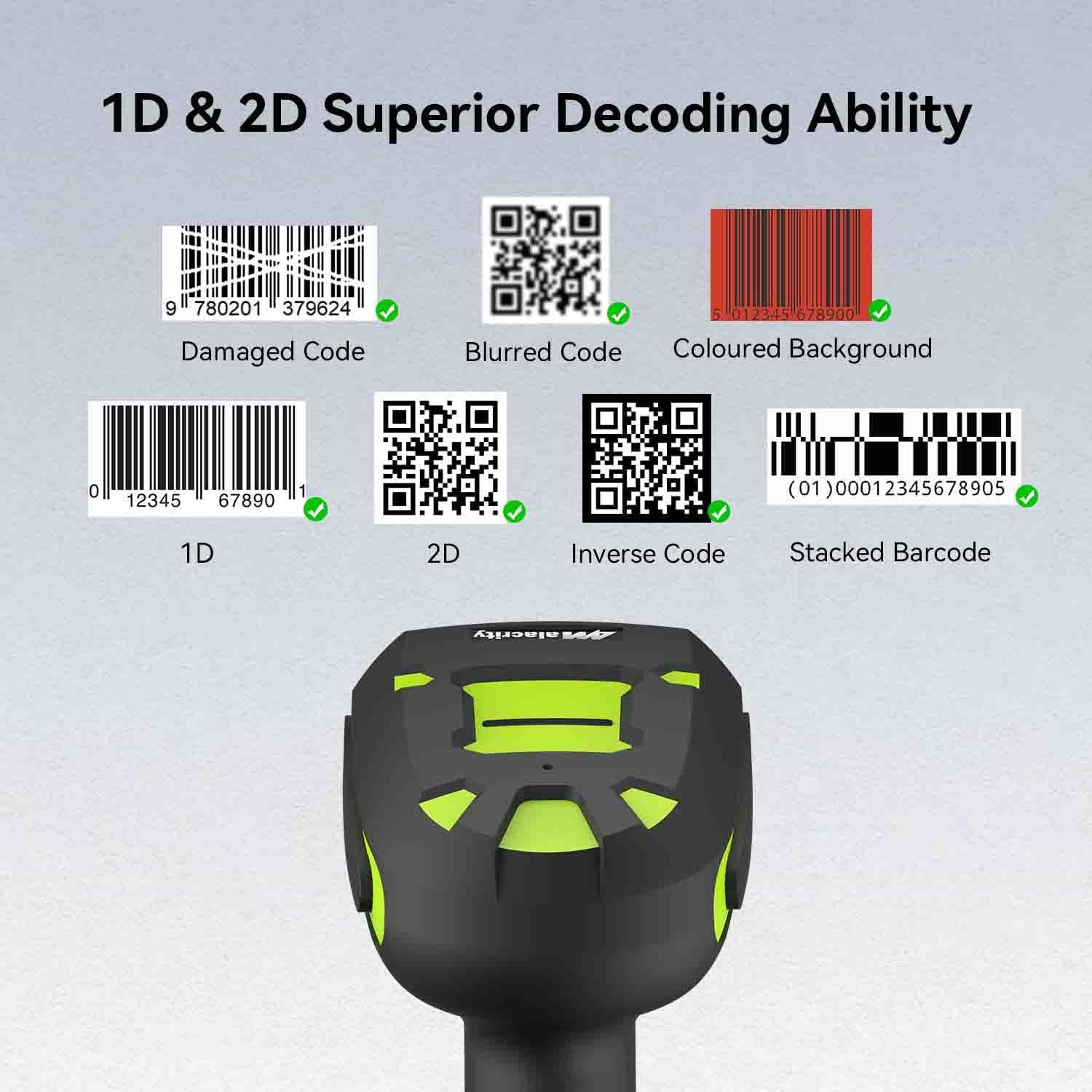 Alacrity Upgraded 2D Industrial Barcode Scanner with Wireless Charging Stand, 1968 Feet Transmission Distance 433Mhz Wireless & Bluetooth 2in1 Barcode Reader, Shock Dust Proof Hands Free, Green