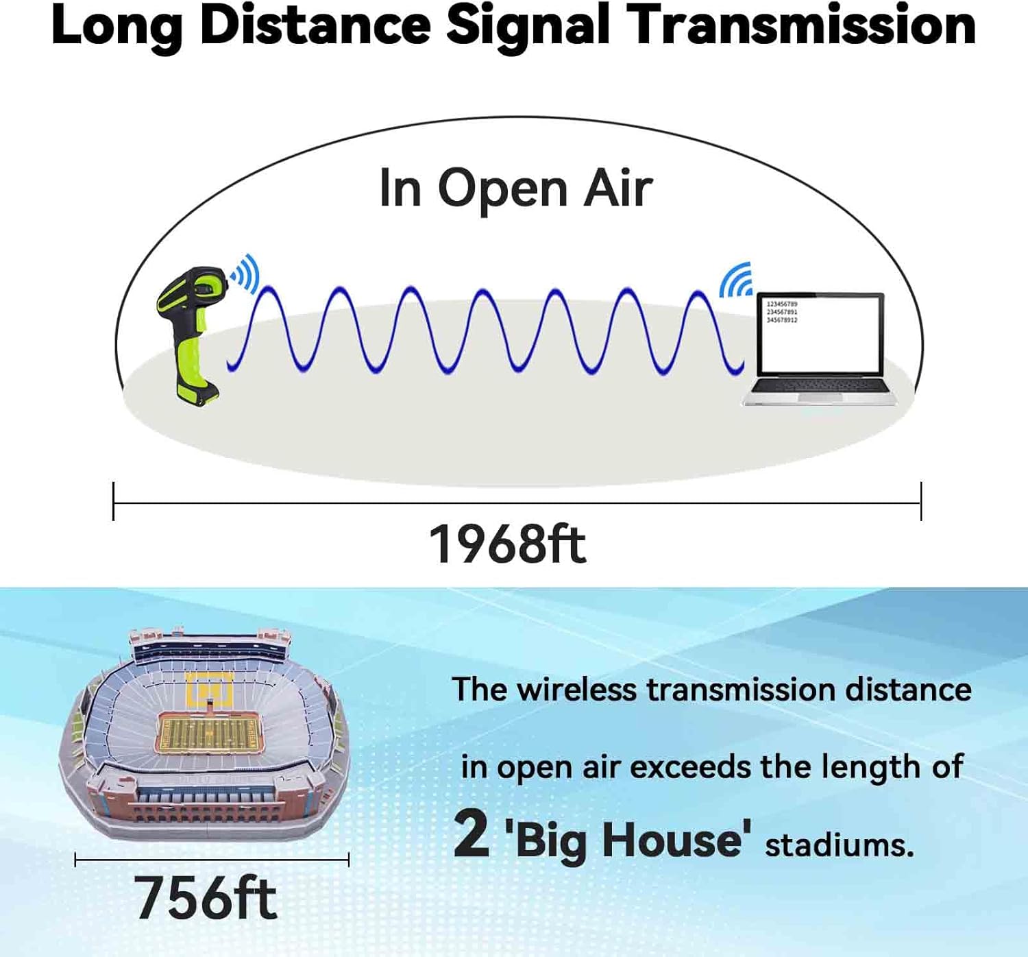 - 【Exceptional Signal Range】 The Alacrity 433MHz RF wireless barcode scanner stands out with its long-distance transmission capabilities. In an unobstructed environment, it can transmit signals up to an impressive 1968 feet (600 meters), and even in environments with obstacles, it reaches a substantial 656 feet (200 meters). This extended range makes it a perfect fit for large warehouses where signal coverage is crucial.