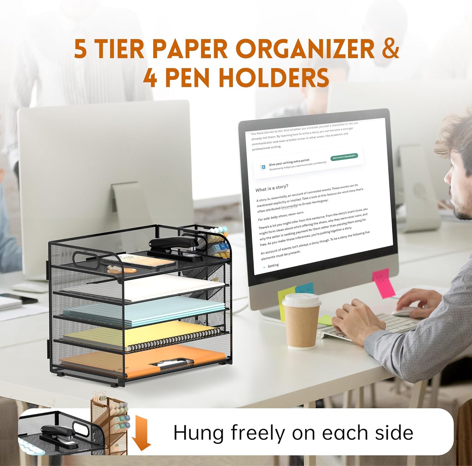 - [Mesh Steel Construction] The mesh desk file organizer is made of lightweight robust metal mesh and reinforced with a solid steel frame that makes our desk tray have long-lasting strength and reliable performance. Equipped with 4 non-slip feet, 5 tier document organizer is hard to be twisted, and its bearing capacity is strong.