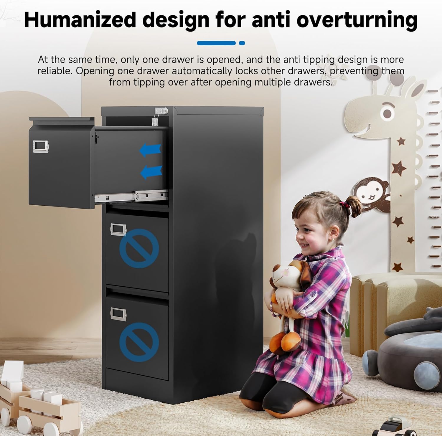 - 【HIGH SECURITY】This file cabinet can lock 3 drawers at the same time with one lock, and is equipped with 2 keys. With an anti-tilting mechanism, when 1drawer is opened, the interlocking system prevents the other drawer from opening, thereby preventing tipping and protecting your safety.