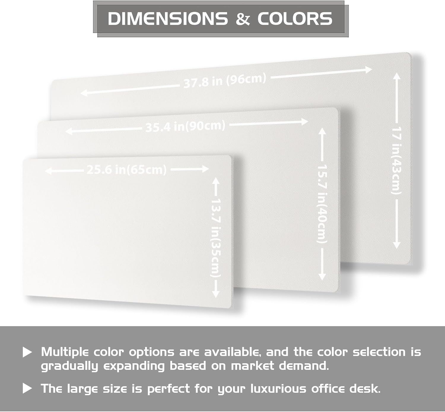 - Variety of Colors and Sizes: Available in a range of colors and sizes, our desk pad can seamlessly blend into diverse office and home environments, catering to individual needs and preferences. Size of 25.6"x13.7", 35.4"x15.7", 37.8"x17", thickness 0.08 inches, thick enough to provide soft and elastic touching; large enough to accommodate your laptop, mouse, keyboard and journal