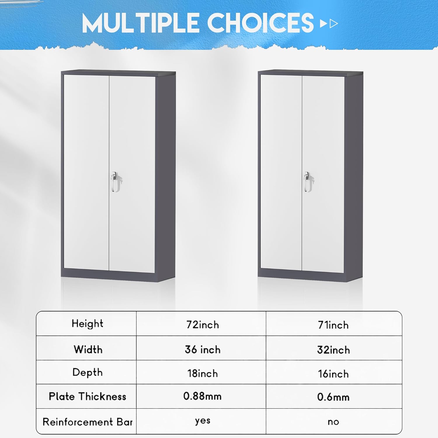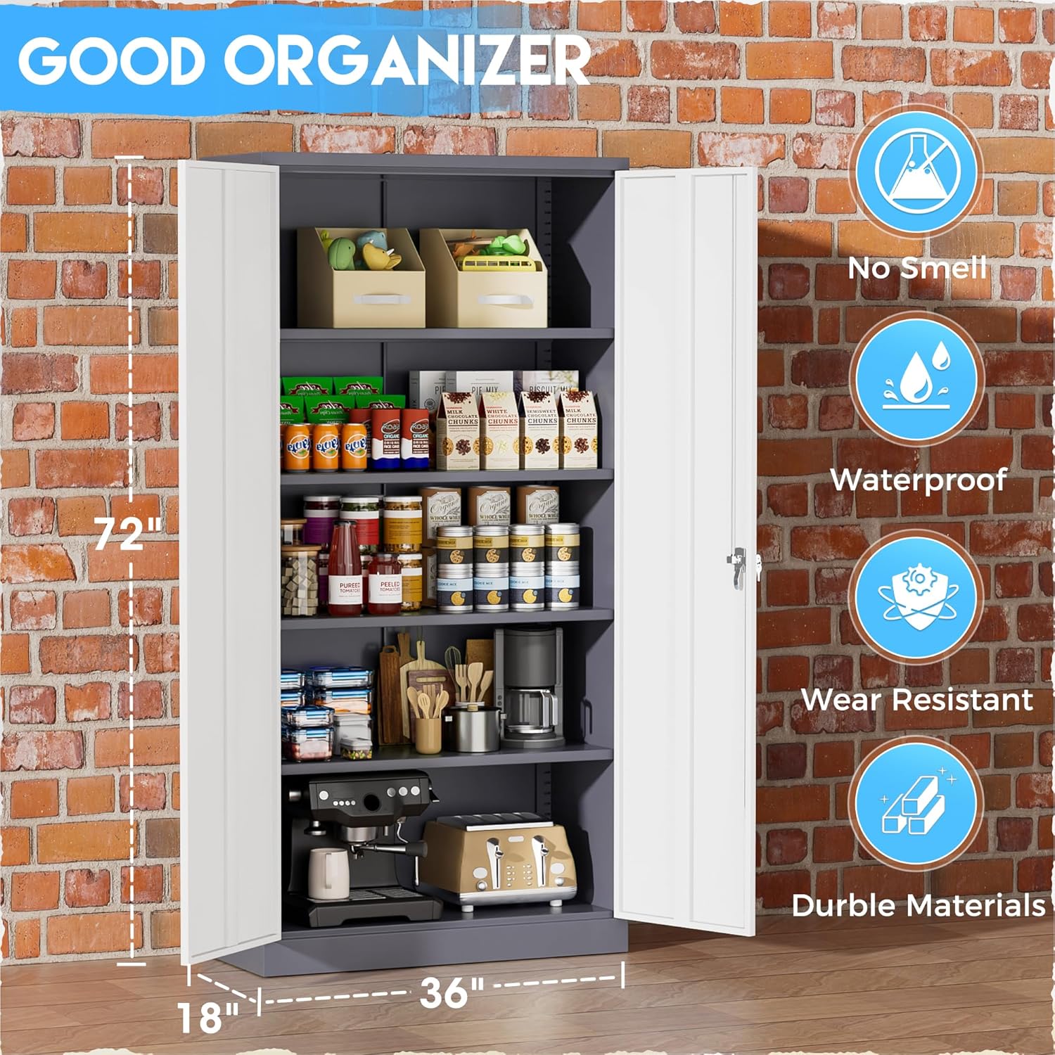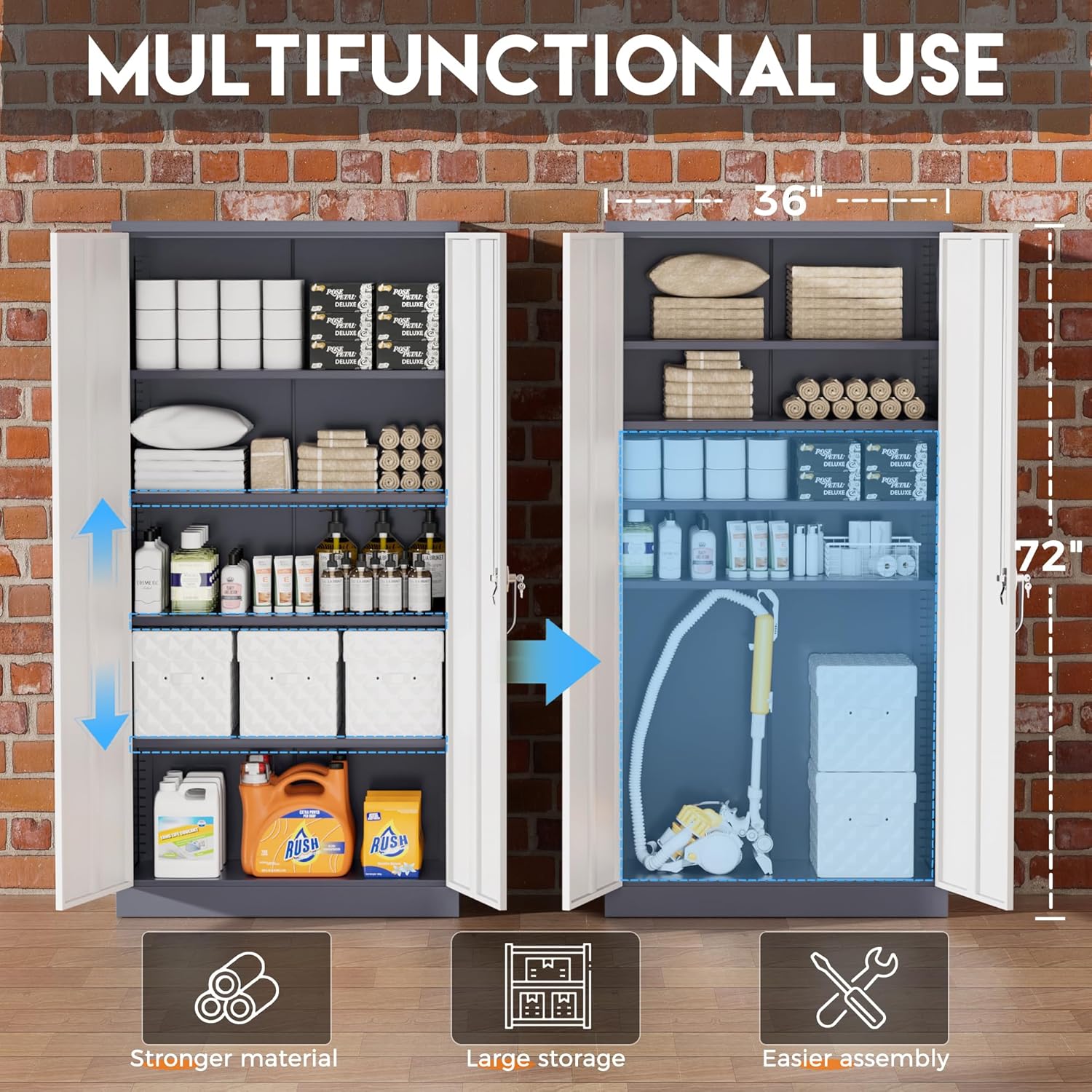 - ăMultipurpose Large CabinetăGreenvelly 72"H x 36"W x 18"D lockable garage organization cabinet with 2 locking doors and 4 adjustable shelves, can move the shelves up or down according to your need, each layer can bear 150 pounds, suitable for storing office documents and tools, as well as heavy items. Durable black metal cabinets are an ideal choice for home office, utility room, laundry, kitchen, garage, school, shop, warehouse, business etc.
