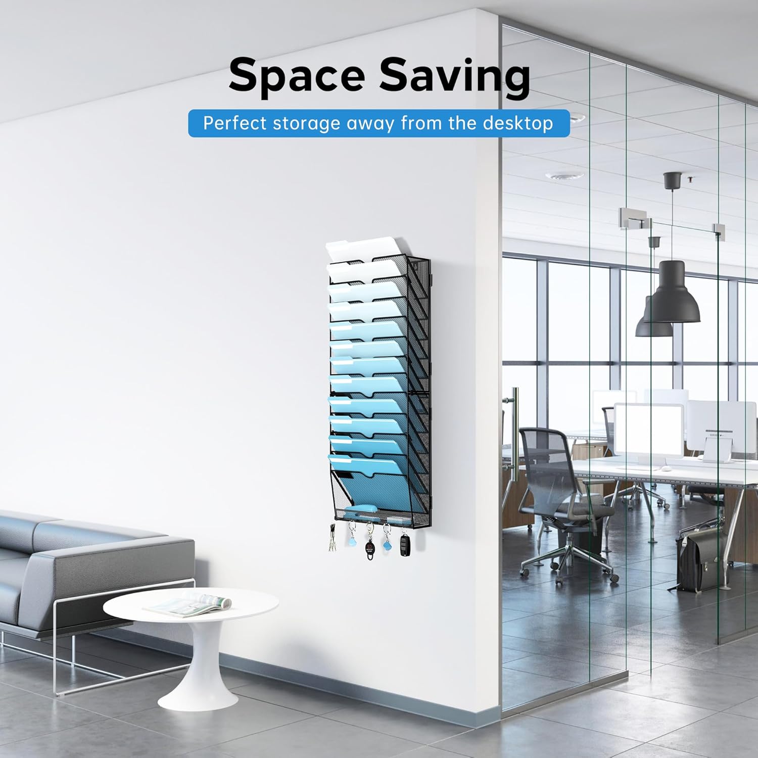 - [12+1 Wall File Organizer] This hanging wall file organizer has 13 vertical pockets wall mounted file organizer with small label to classify your documents, you can store folders, magazines and paper in it. The 1 bottom flat tray is great for stationary, desk accessories.