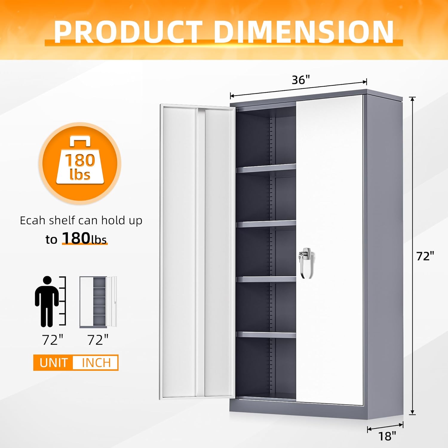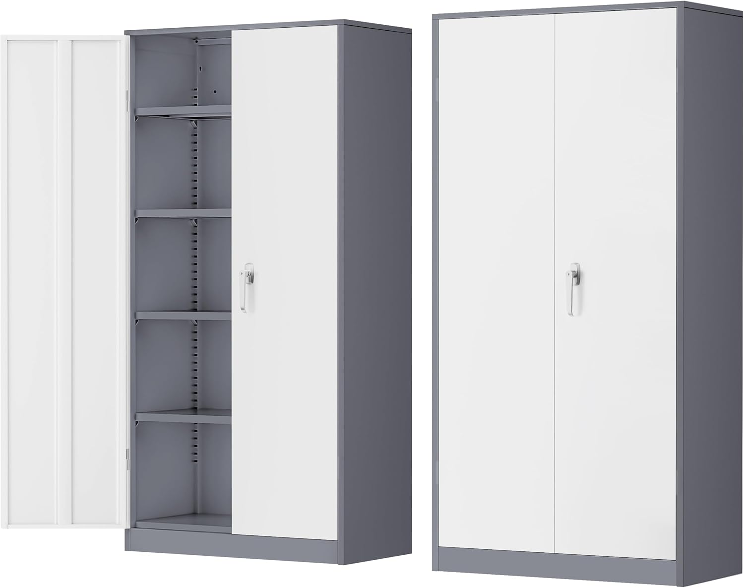 - 【Large Capacity】: Tall steel storage cabinet with 4 adjustable shelves, meets your different needs of the placing item. And also each shelf can load up to 180lbs, can be removed or adjusted. 2 Locking keys and 3-pointed locking system highly secure your belongings
