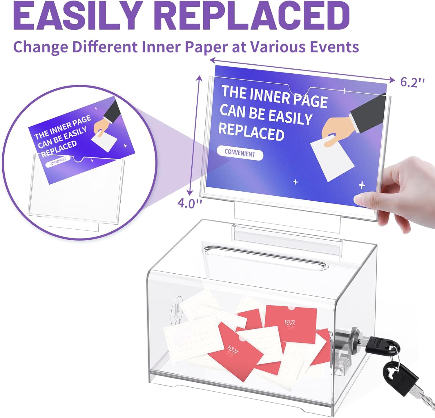 - Personalized customization: Easy to Replace Inner Pages, Donation box with lock is easily change diverse inner paper at various events. Clear suggestion box can be customized according to your preferences and requirements, such as adding labels, stickers, logos, etc., highlighting your brand and theme, and attracting more attention and support.