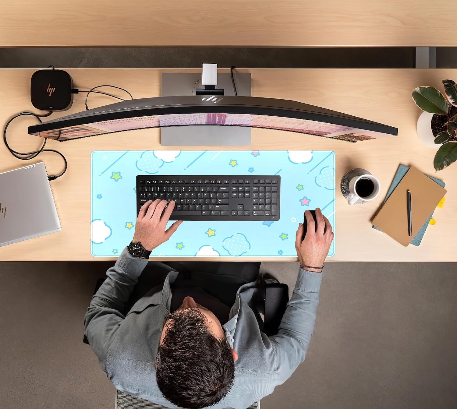 Kawaii Pastel Blue Star Grid Desk Pad, Large Gaming Mousepad & Keyboard Mat, XXL Office Desk Decor for Women, 31.5"x15.75"