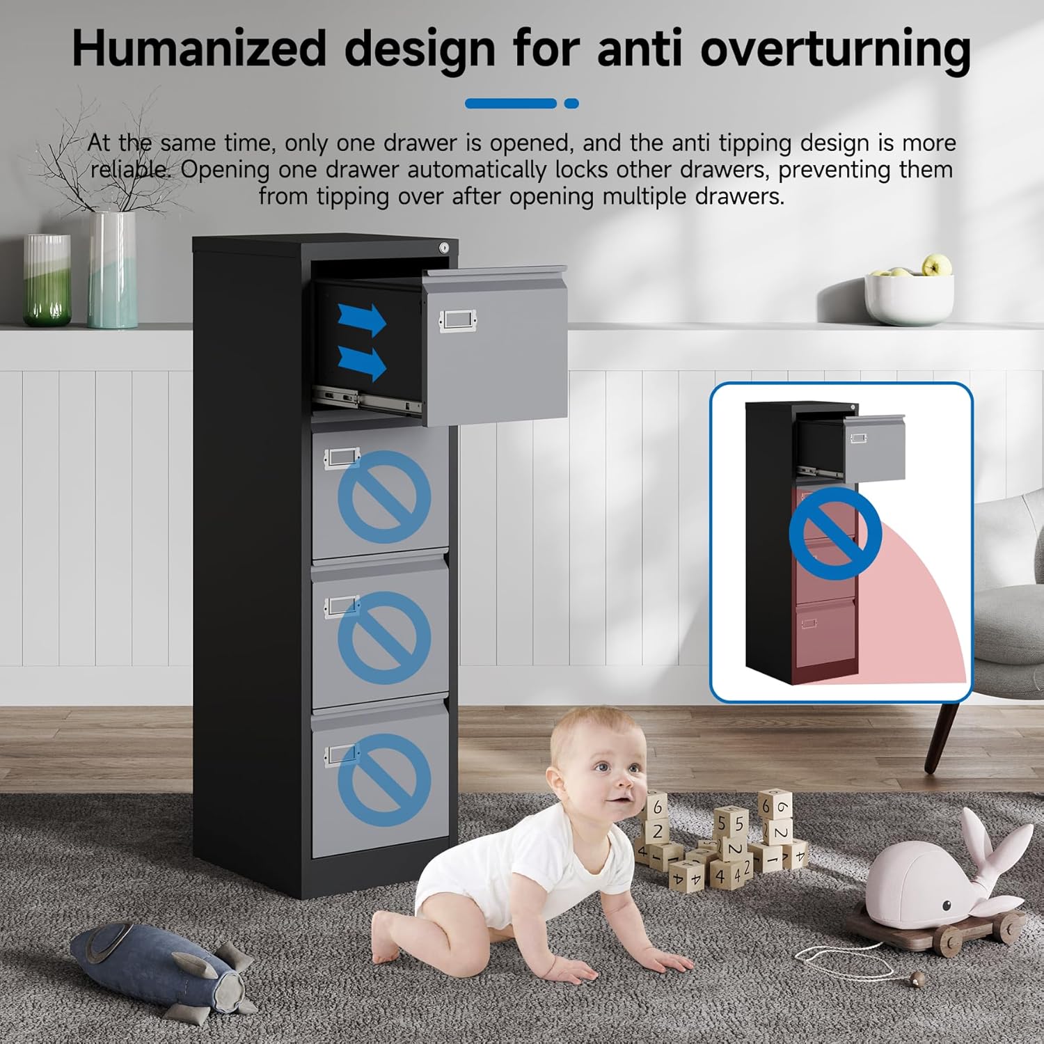 - 【HIGH SECURITY】This file cabinet can lock 4 drawers at the same time with one lock, and is equipped with 2 keys. With an anti-tilting mechanism, when 1drawer is opened, the interlocking system prevents the other drawer from opening, thereby preventing tipping and protecting your safety.