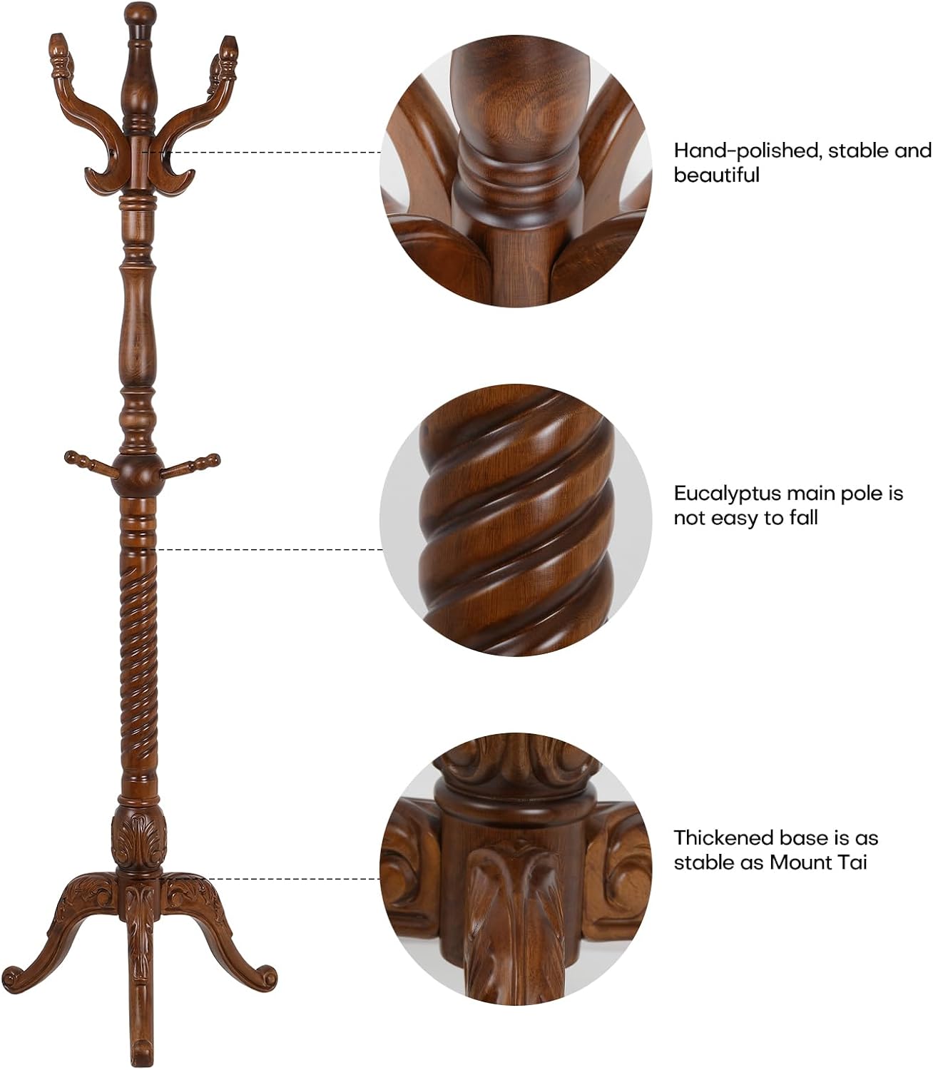 - 【Heavy Duty Construction-Extremely Stable】: This wood coat rack stand has thickened solid 3-legged base supports on the bottom for added stability and perfect balance, so it will not fall off even when shaken and can support up to 160 pounds (each hooks can hold up to 20lbs). The wood coat tree is extremely sturdy and strong enough to support coats, hats, scarves, briefcases, bags, backpack, winter jackets.