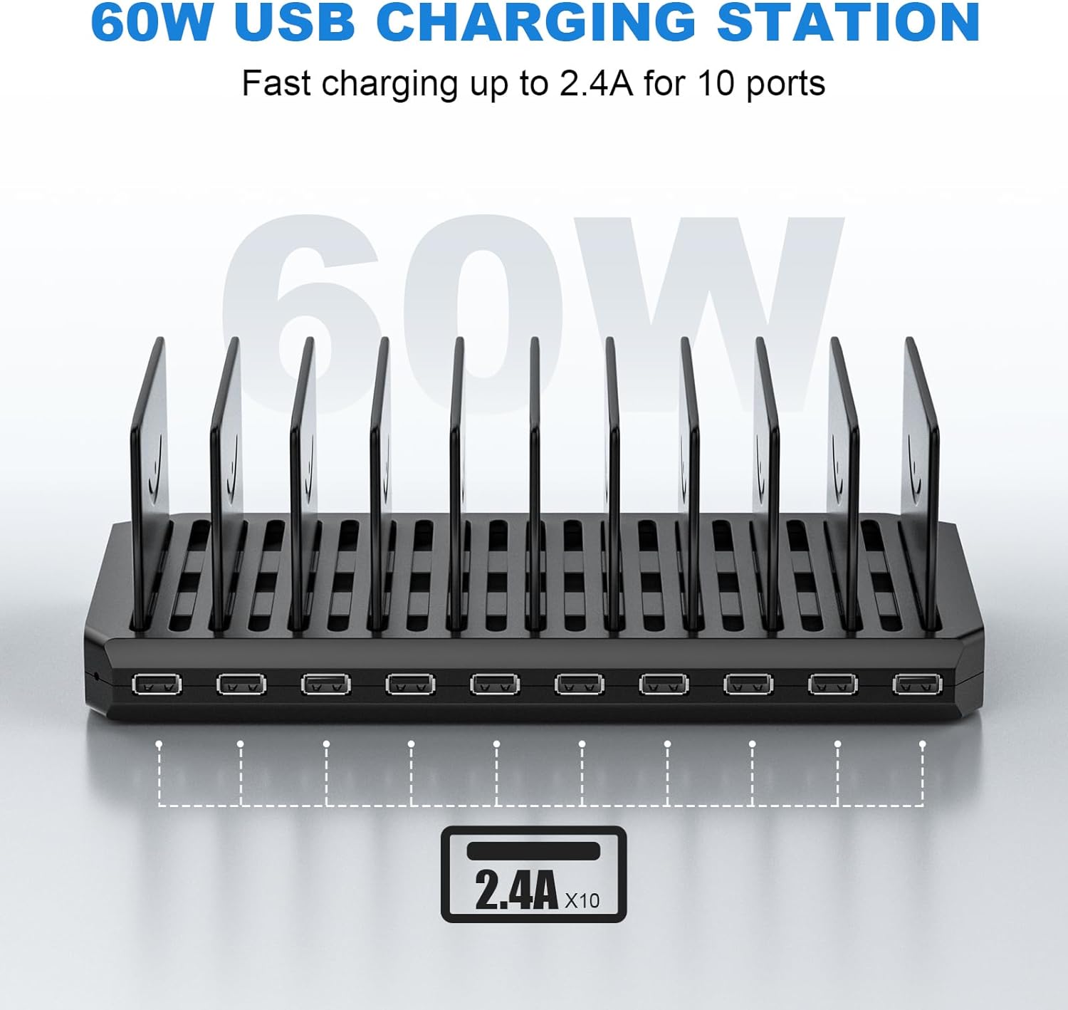 - ă10-in-1 USB Chargeră10 Port USB Charging Station with the newest technology, The total output power is 60W, Providing support for 5V/2.4A fast charging for devices. The 10-in-1 charger docking Organizer can automatically detect the connected devices to adjust the corresponding current output to minimize the charging time for your phone.