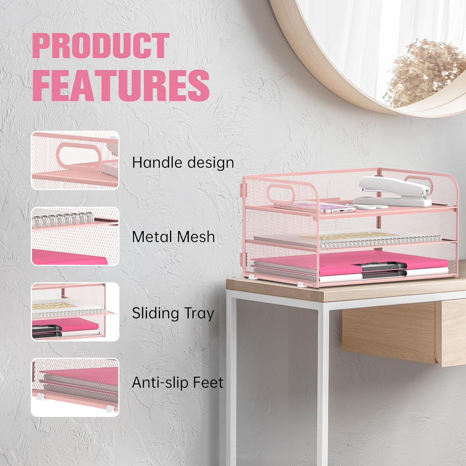 Daltack 3-Tier Paper Organizer with Handle, Mesh Desk Organizer Letter Tray, Paper Tray Organizer File Organizer for A4 File Folder, Pink