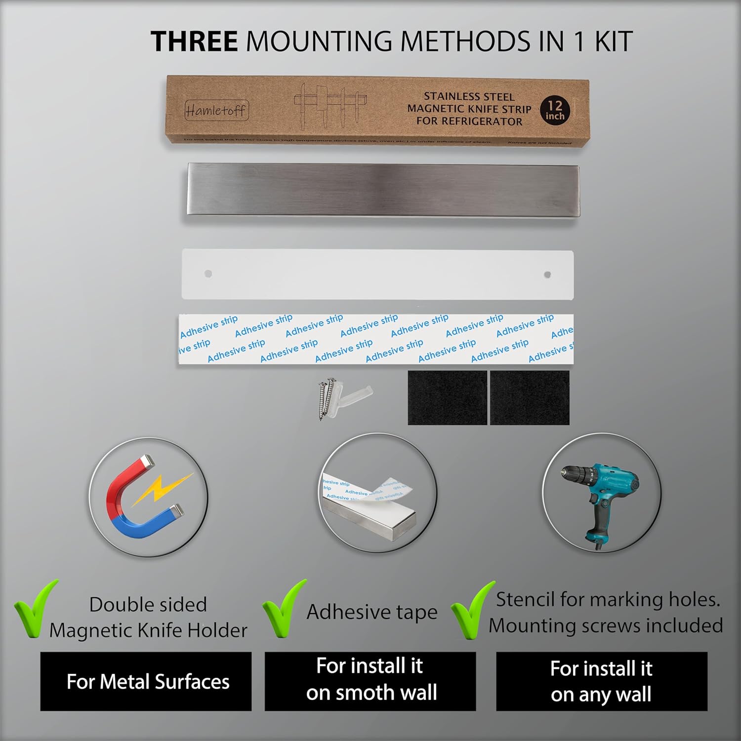 - 📐Three installation methods: You can also install the magnetic knife wall holder on any wall surface. The kit includes strip adhesive designed to install magnetic knife holder on the wall no drill on a smooth wall surface. There are screws also included in case you need to drill holes and mount the magnetic strip on any surface. You choose the method of installation that is the most convenient for you depending on the smoothness of your wall