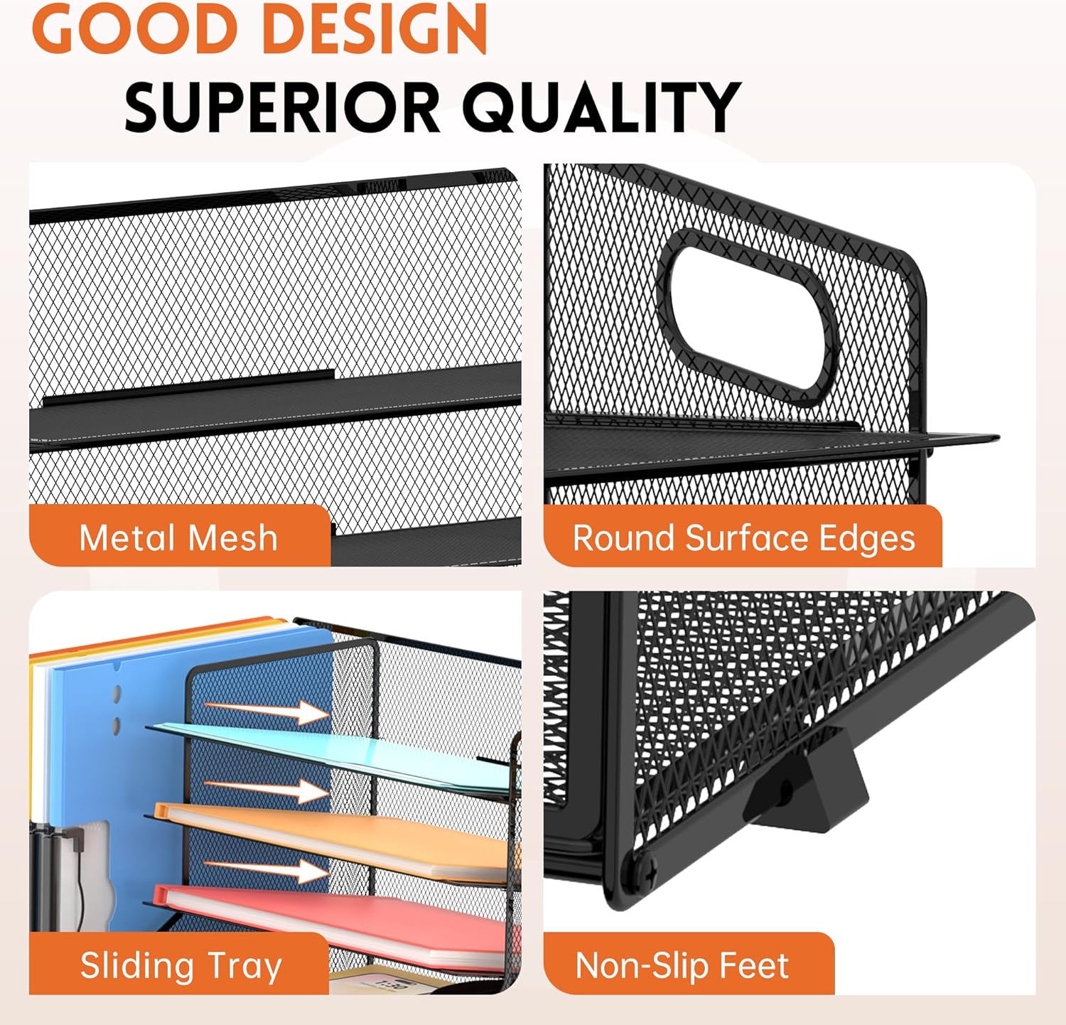 - STRONG AND ROBUST - Our paper organizer for desk is made of solid metal mesh, soldering is very strong, very robust, together with rubber non-slip pads to prevent sliding, avoid surface scratches. It is a robust desk organizers and storage.