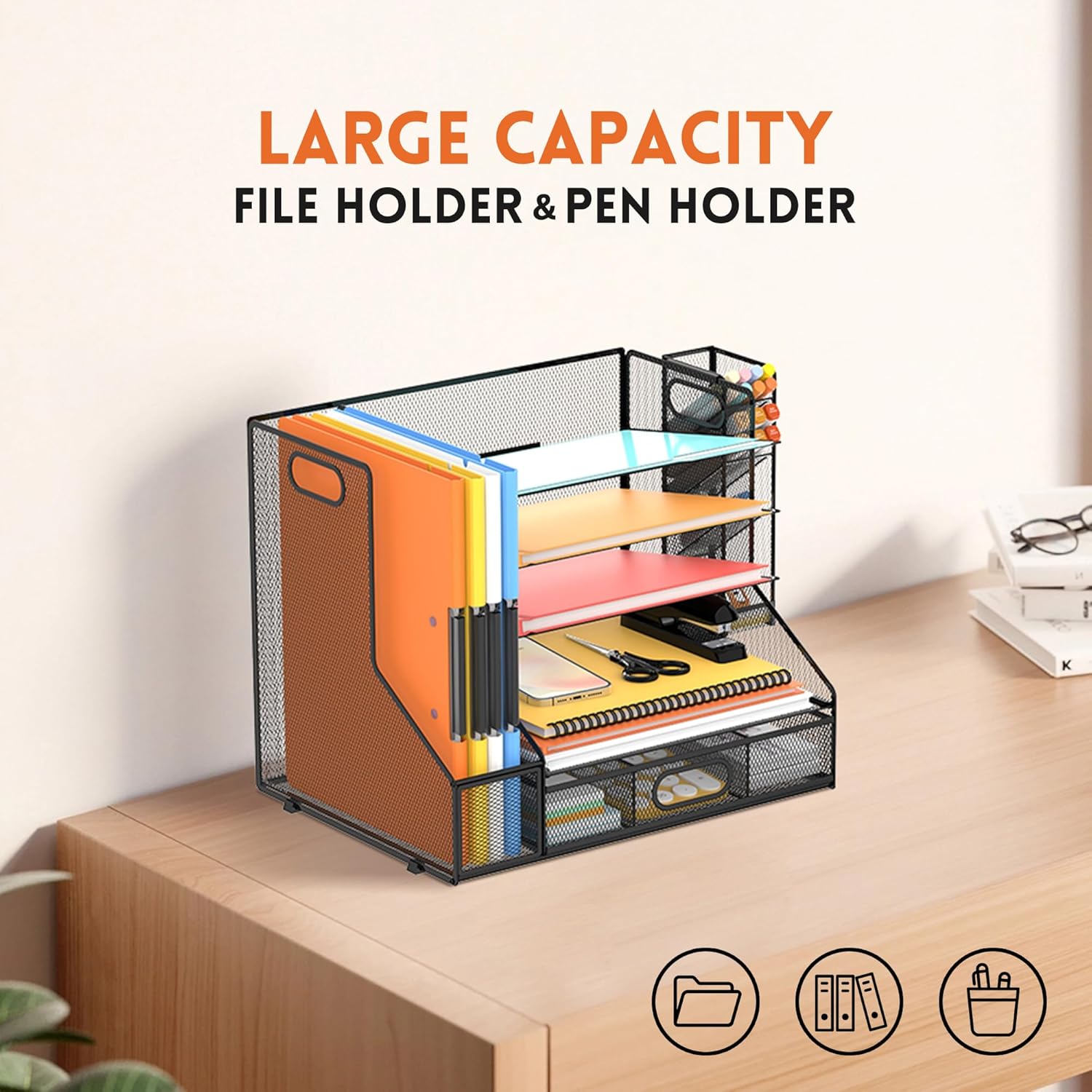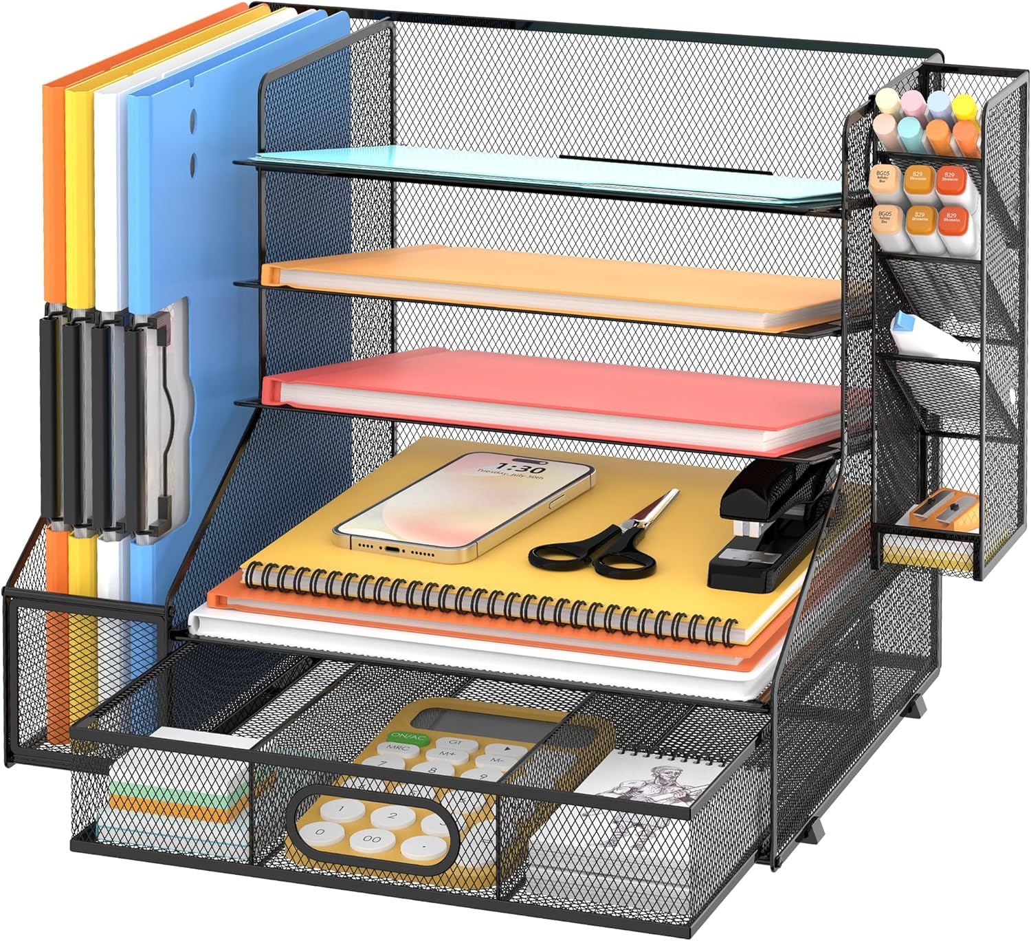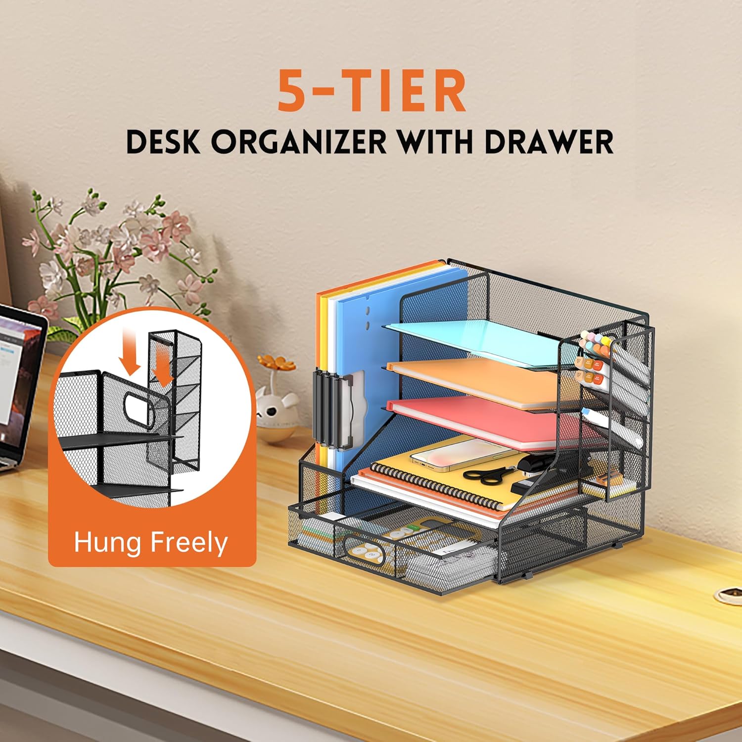 DALTACK Mesh Desk Organizer, 5-Tier Paper Letter Tray with File Holder & Pen Holder & Sliding Drawer, Desktop Organizer and Storage for Desk Accessories Office Supplies, Black