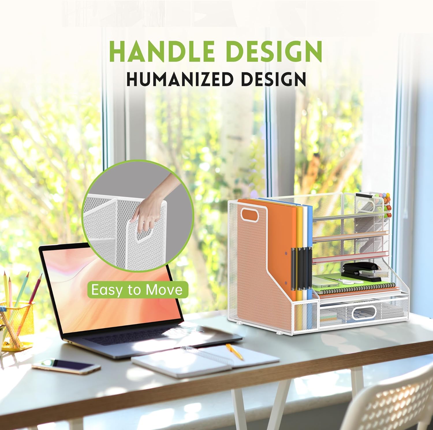 - HANDLE DESIGN - The handle design of this 5-tier desk file organizer is very user-friendly. With two portable handles of this paper organizer storage, you can move the desk organizer with file holder to any place you want. It's very convenient.