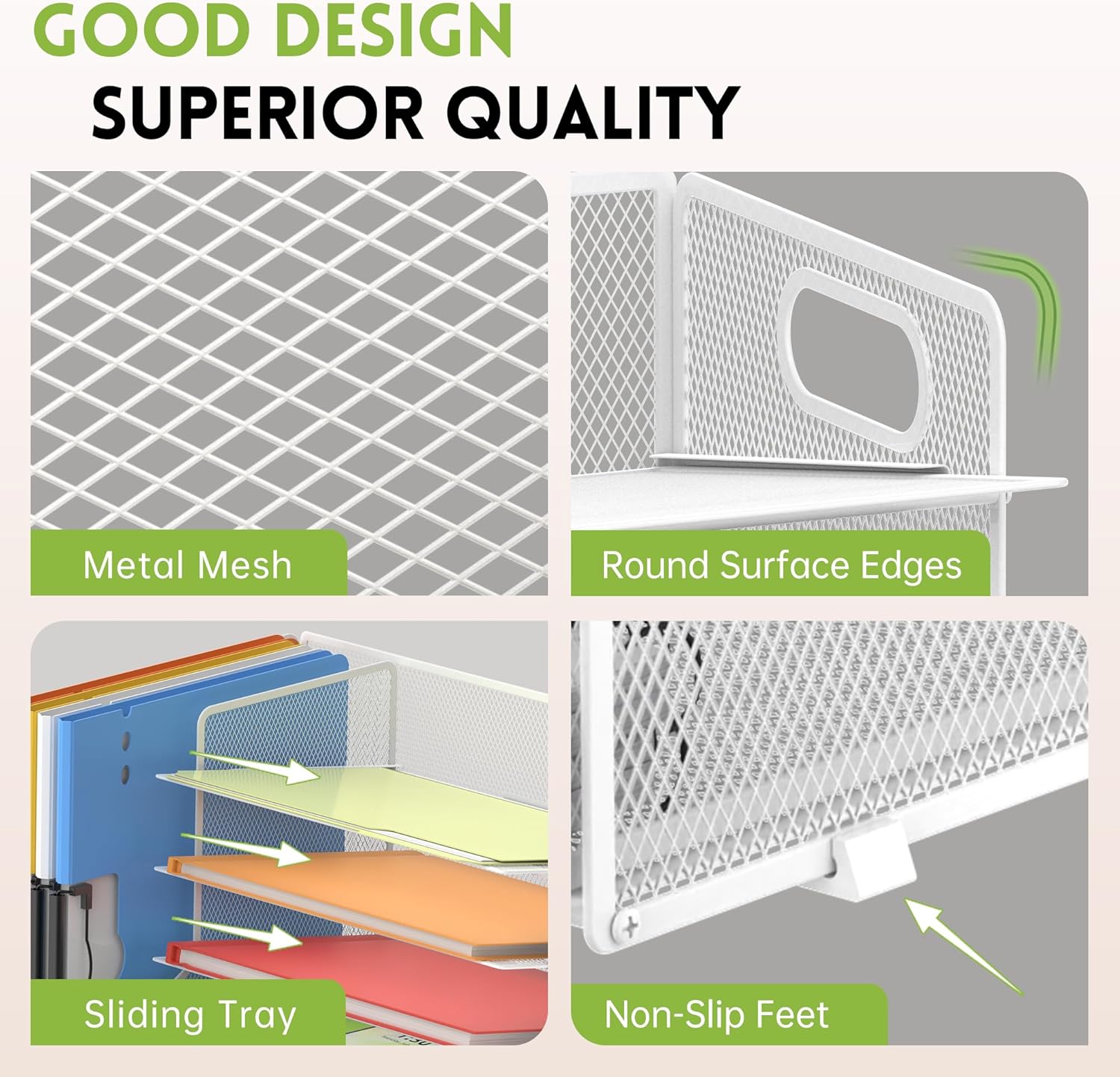 - STRONG AND ROBUST - Our paper organizer for desk is made of solid metal mesh, soldering is very strong, very robust, together with rubber non-slip pads to prevent sliding, avoid surface scratches. It is a robust desk organizers and storage.