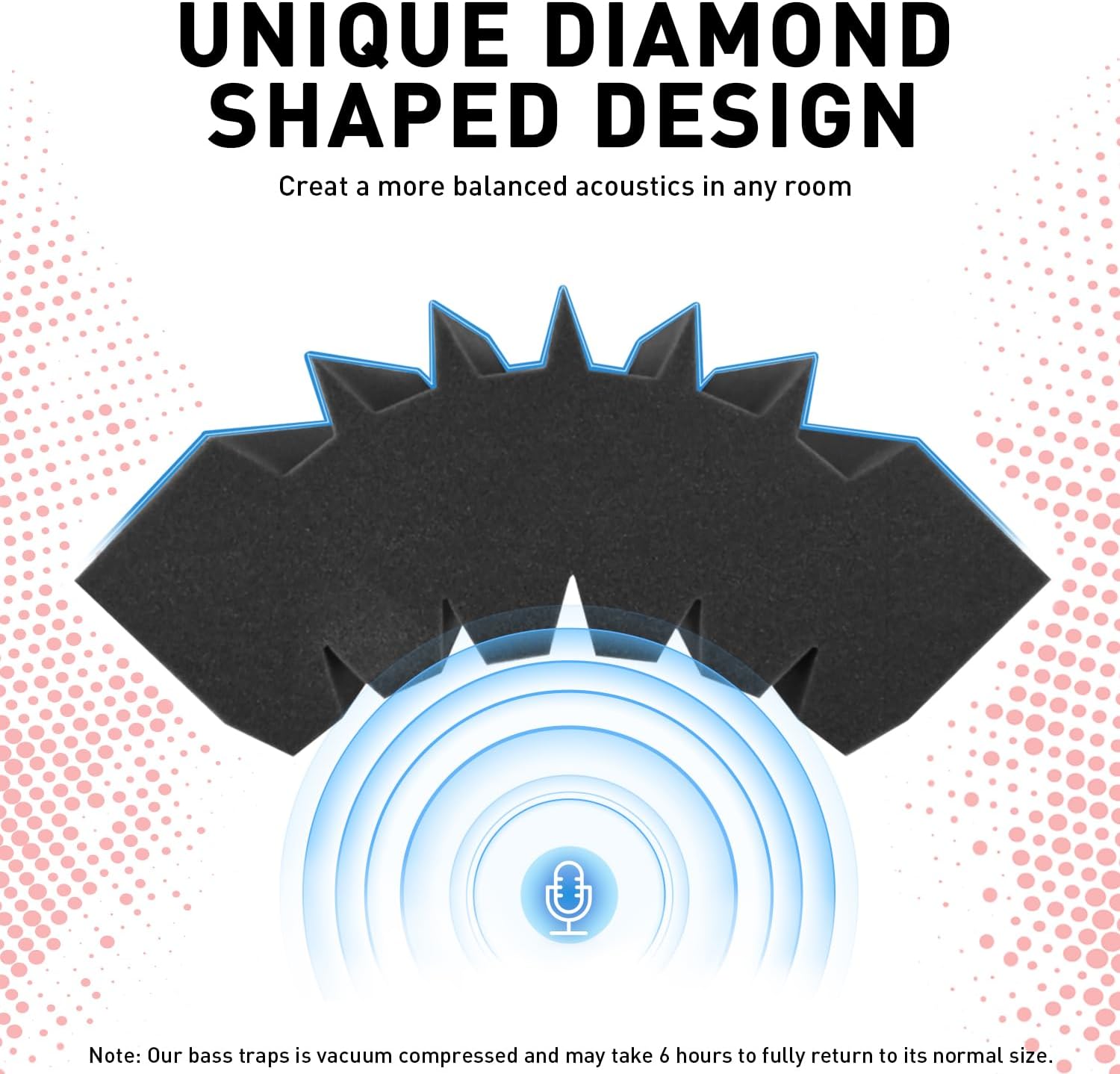 - Improve Low Frequency: Acoustic bass traps corner are made from a high density, fireproof, non-toxic, and high-quality material, to help eliminate reverb and echoes of bass sounds. They reduce unwanted reflections, dampens and diffuses mid to low frequency sound waves inside a room to minimize interference, and increases sound clarity.