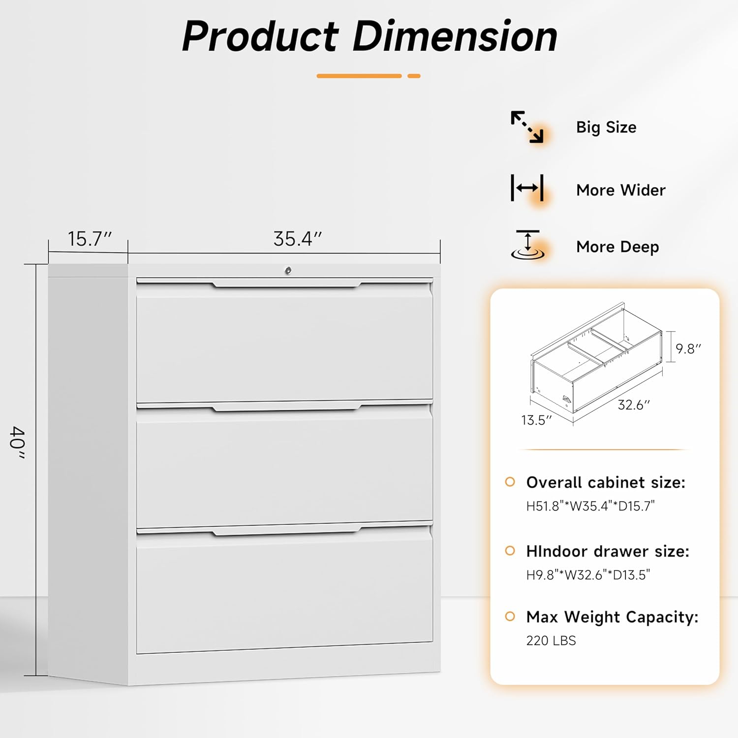 - 🪁【LARGE CAPACITY THREE DRAWER】Our 3 drawer lateral file cabinet has a huge storage space, 40" high * 35.4" wide * 15.7" deep. And it comes with an adjustable hanging rod to store different types of files, such as letter, legal, A4, F4 and other size folders. It is perfect for you to customize the way you organize your files!