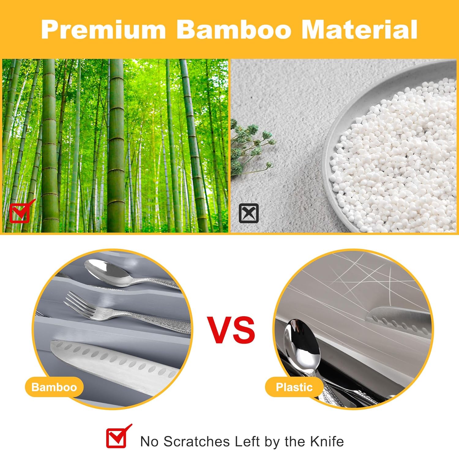 - â ăSturdy and Well-madeăOur silverware tray for drawer is made of minimally refined natural bamboo, a renewable, sustainable source, making them a green choice, with the age of over 4 years, which makes the silverware holder durable enough for long time use. Unlike the plastic and metal drawer organizer, our flatware & utensil is water & odor resistant, the silverware organizing tray is perfect for years of use, especially in kitchens where things can get messy quickly.