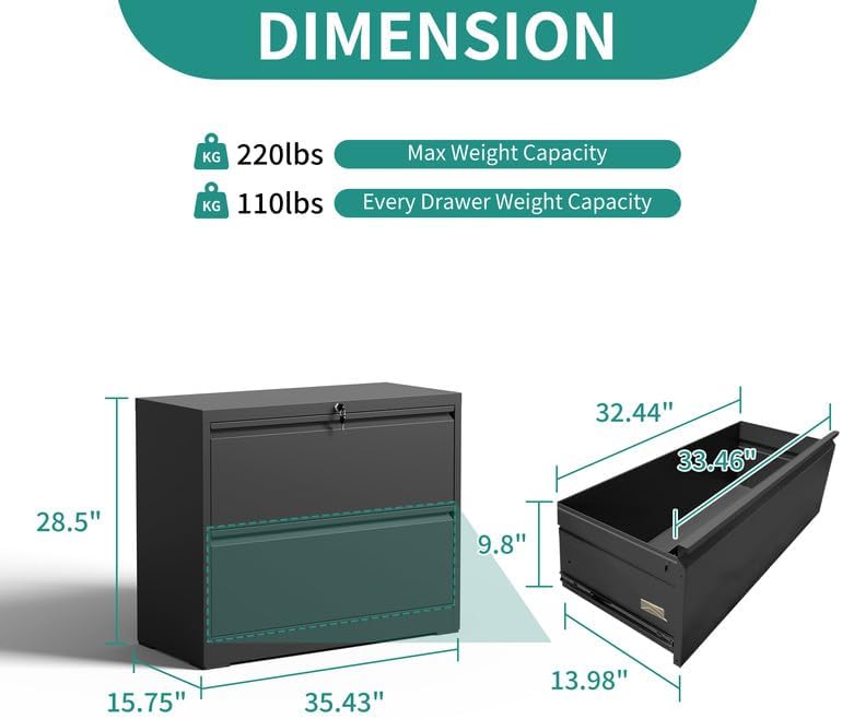 - 【Humanized Design】This 2-drawer filing cabinet has ball bearing fully floating drawers for smooth, quiet opening and closing. This friendly feature enhances convenience and minimizes disruption in the office environment. Overall size: H28.5*W35.43*D15.75 inch