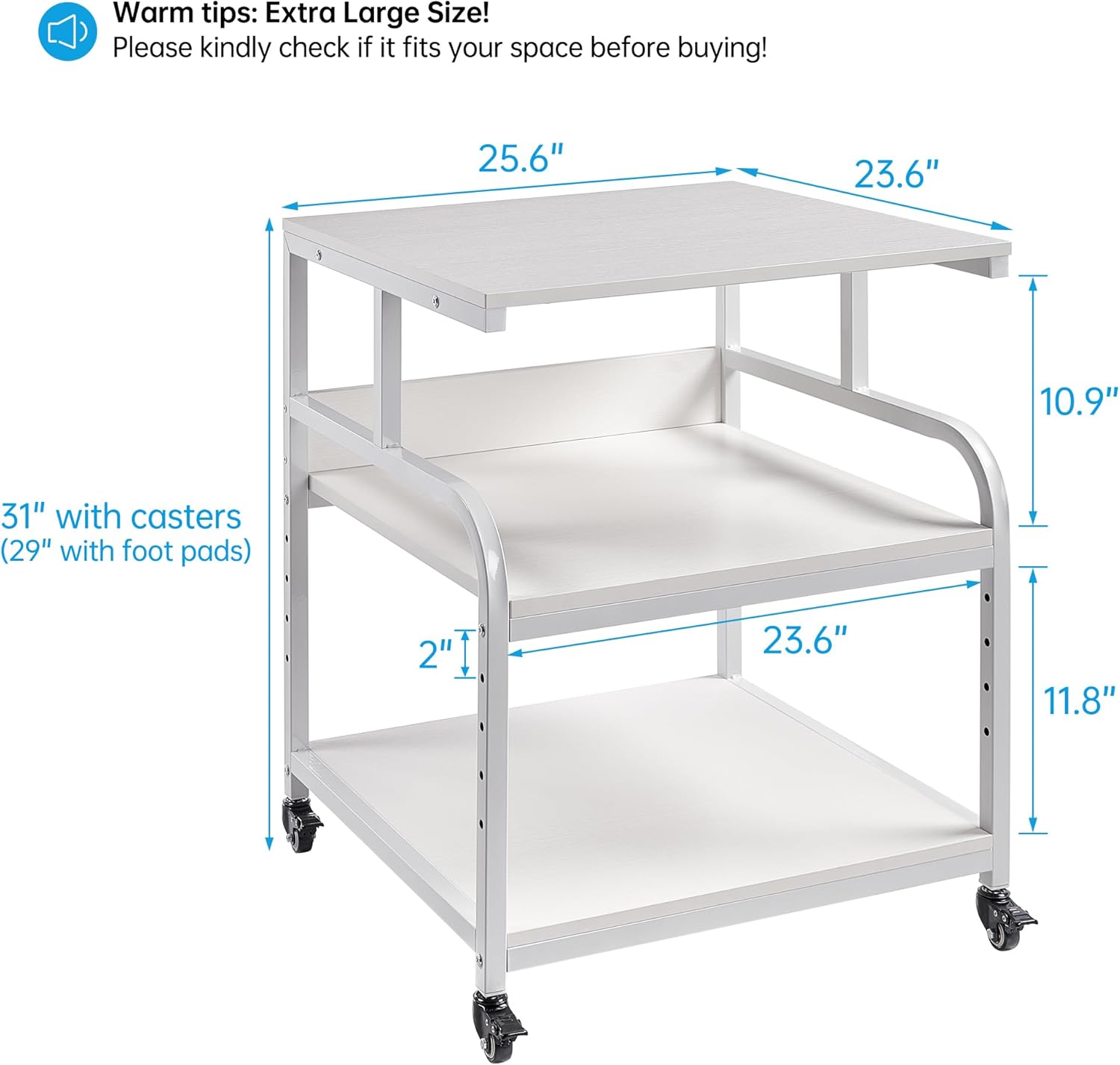 - 【Extra Large Size】With overall product dimensions of 25.6"W x 23.6"D x 29"H/31"H and a weight capacity of at least 100lb on each tier, this stand is designed specially for extra large and heavy printers, scanners and other bulky equipment. Additionally, 3 tier storage shelves offer spacious room for organizing and storing office supplies such as paper, toner, and more, ensuring easy access while working or studying.