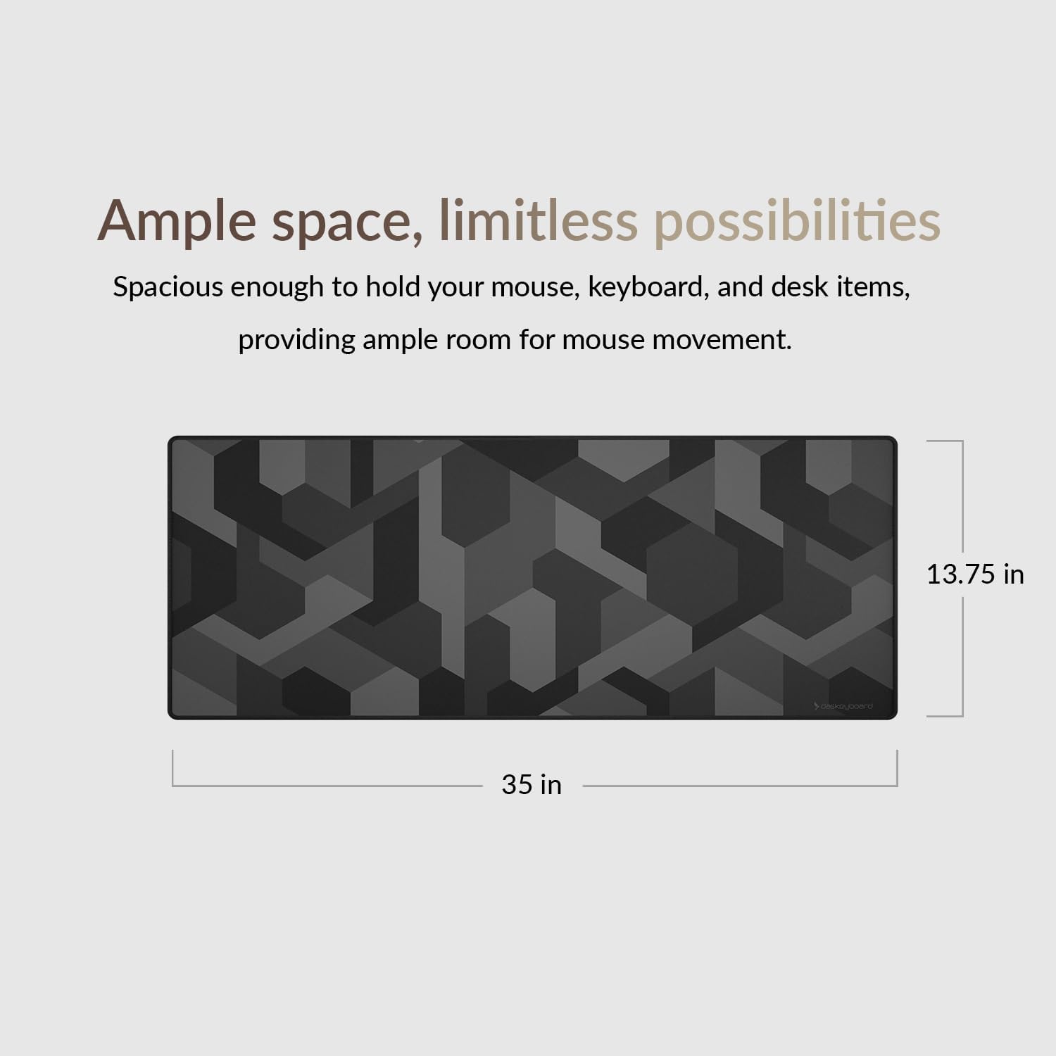 - EXTENDED LARGE SIZE: Measuring an impressive 35 x 13.75 inches, the Cyber Shadow Camo Desk Mat offers a vast surface for your mouse, gaming keyboard, and other essentials. Dive into work or games with ample space and enjoy having all the room you need to get the job done.