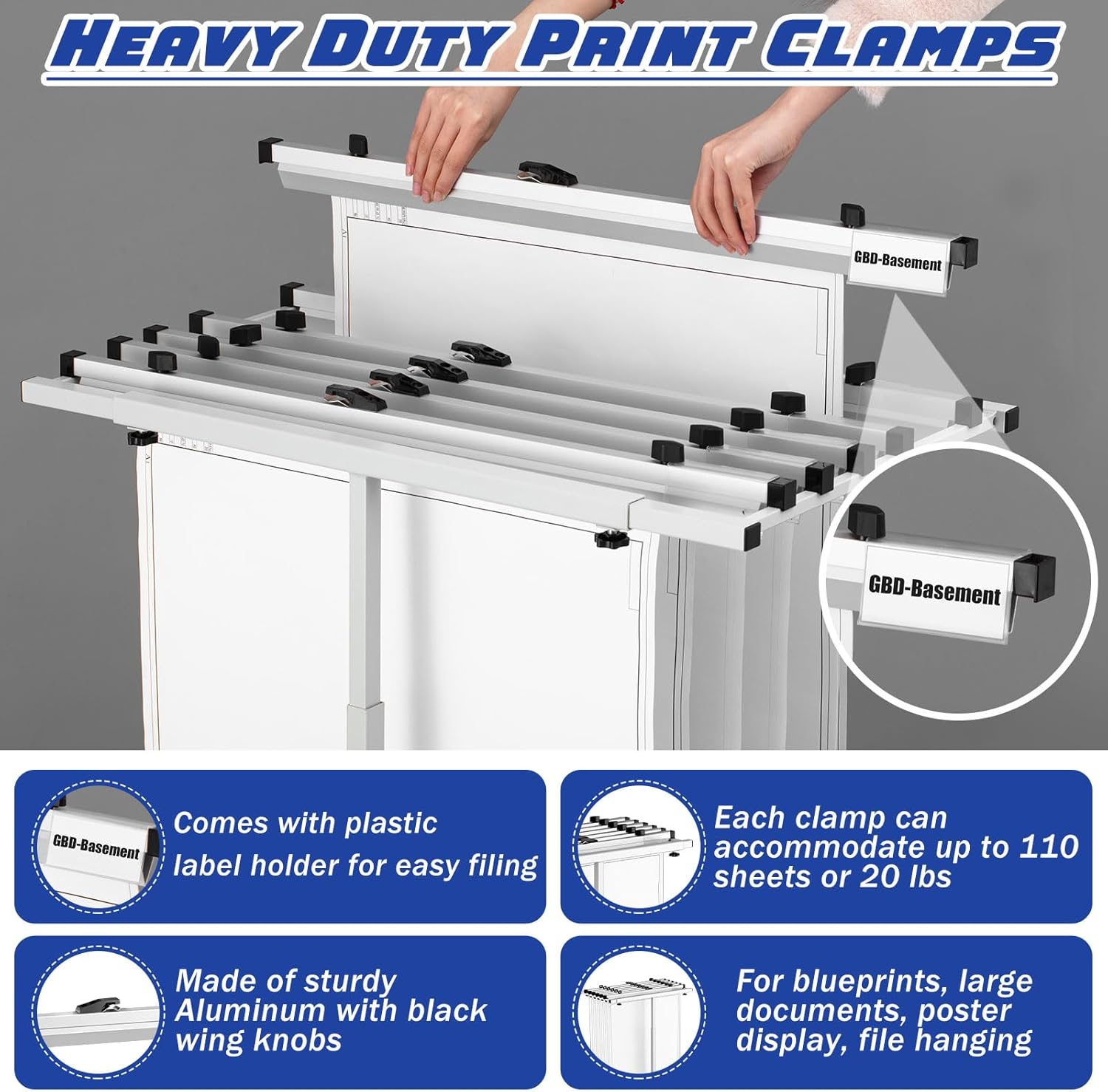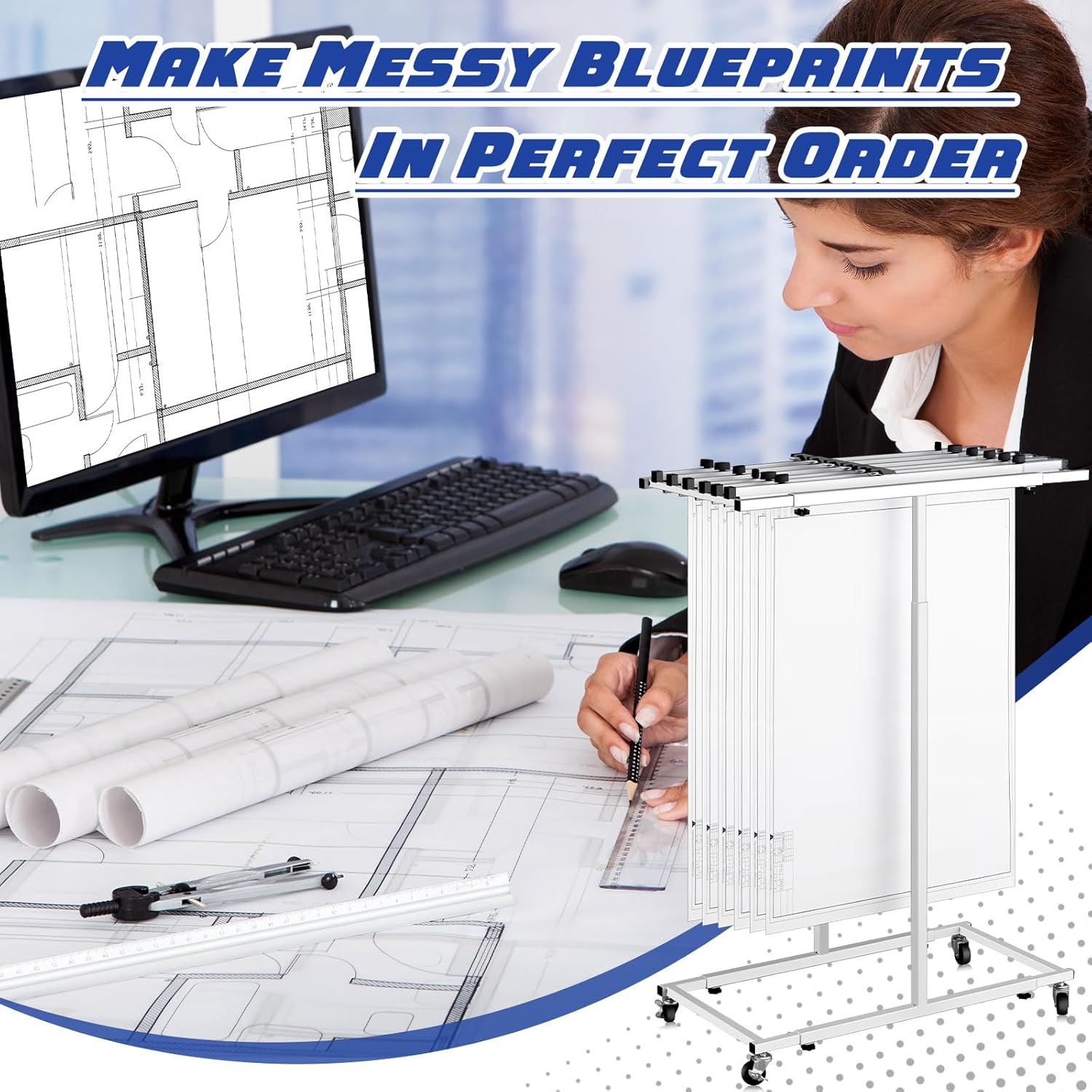 - High Capacity: the mobile blueprint holder has been designed for high load capacity; Each hanging clamp can hold up to 100 drawings, this allows for systematic organization of numerous documents; Turn your disordered workplace into a streamlined, well organized space