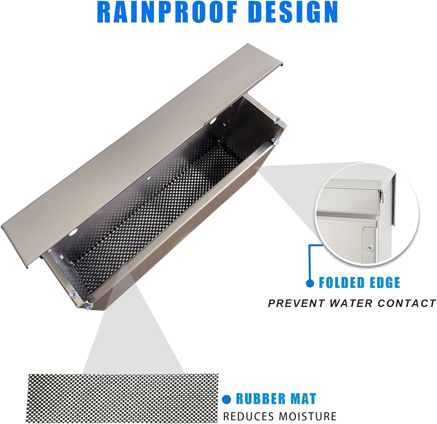 - NO MORE WET MAILS: Our waterproof mailbox has folded edges covering the top of the stainless steel wall mount mailbox, so raindrops will drip down naturally and not get inside the mail box, keeping your items clean and dry. In addition, we include a rubber mat to keep moisture away.