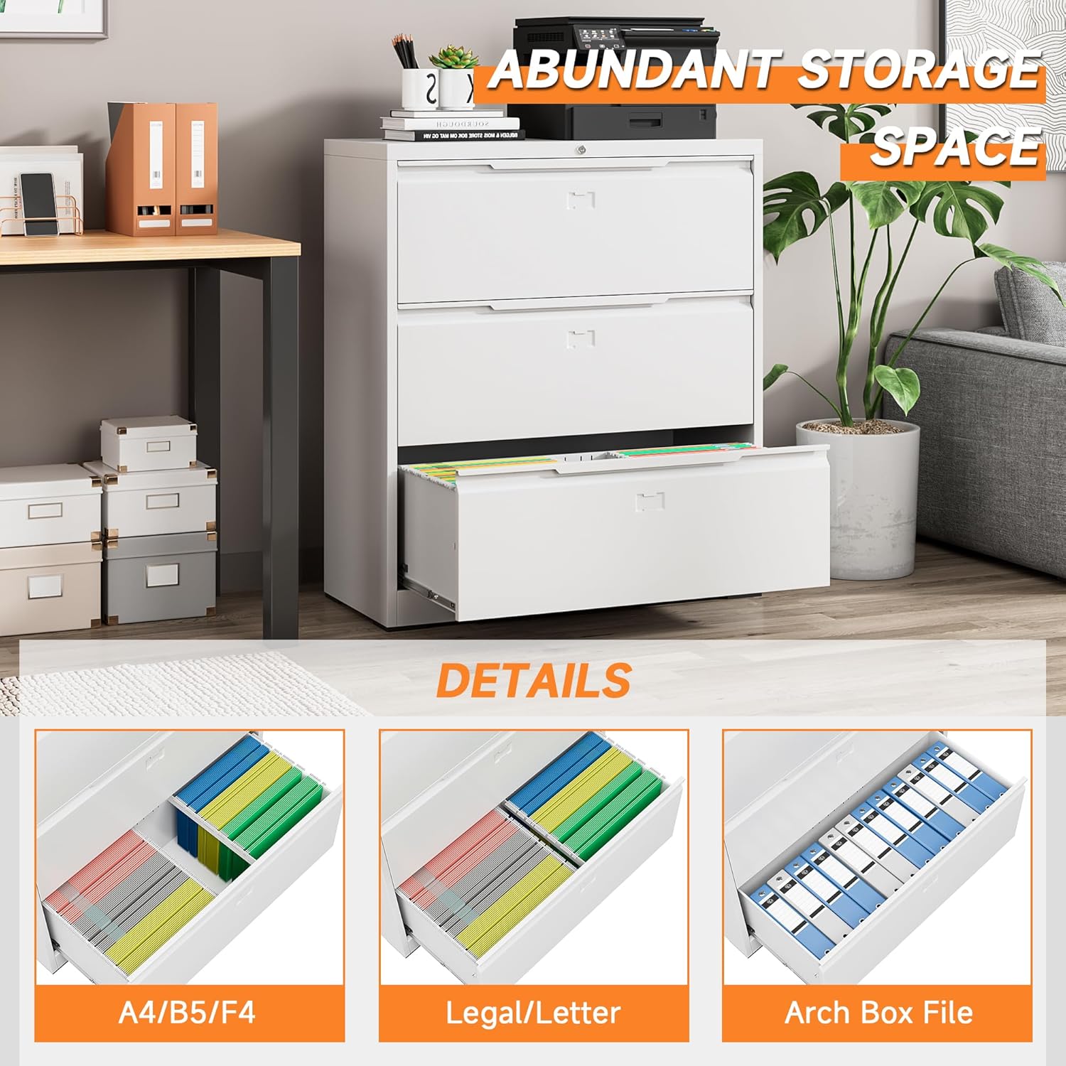Lateral File Cabinet, 3 Drawer Lateral File Cabinet with Lock, Lockable Metal File Cabinet for Home Office, File Cabinet for Letter/Legal/F4/A4 Size (White, 3 Drawer)