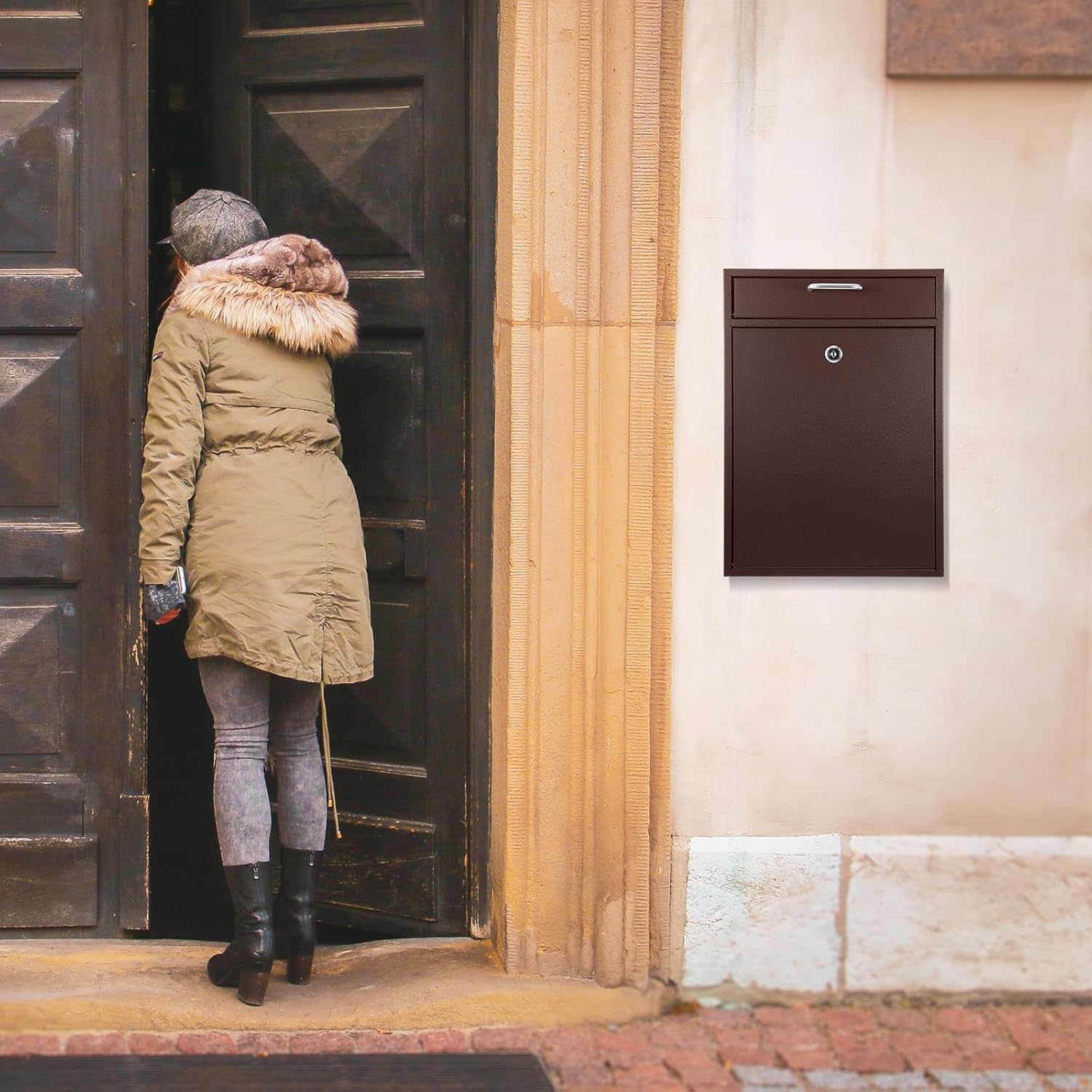 Locking Mailbox with Key for Outdoor 16.2 x 11.2 x 4.7 Inches Large Wall Mount Mail Box with Lock Security Mail Drop Metal Collection Boxes Hanging Secure Postbox(Brown)