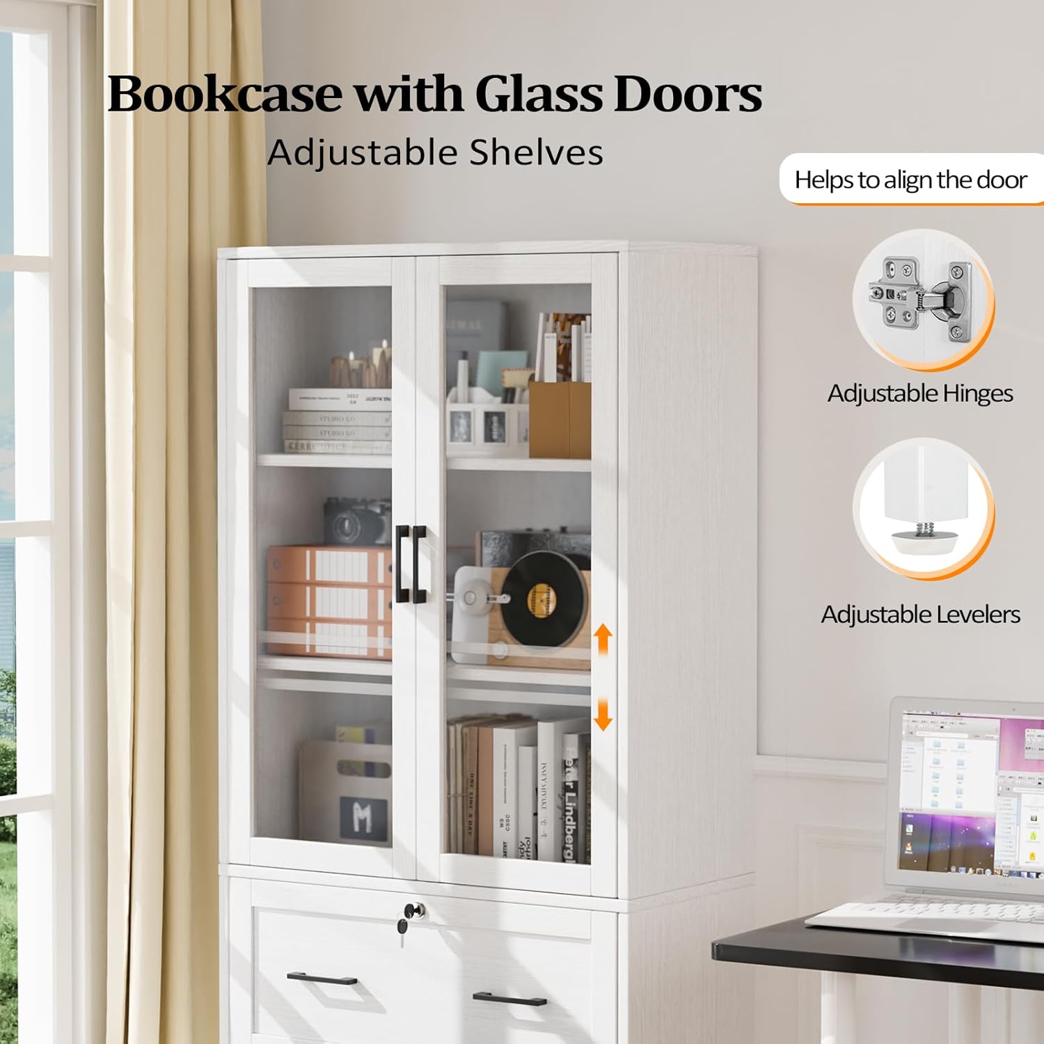- ăGlass DoorsăThis display cabinet with glass doors features 3 compartments with adjustable shelves for books and artworks of different heights, and it is also a great showcase in your spaces
