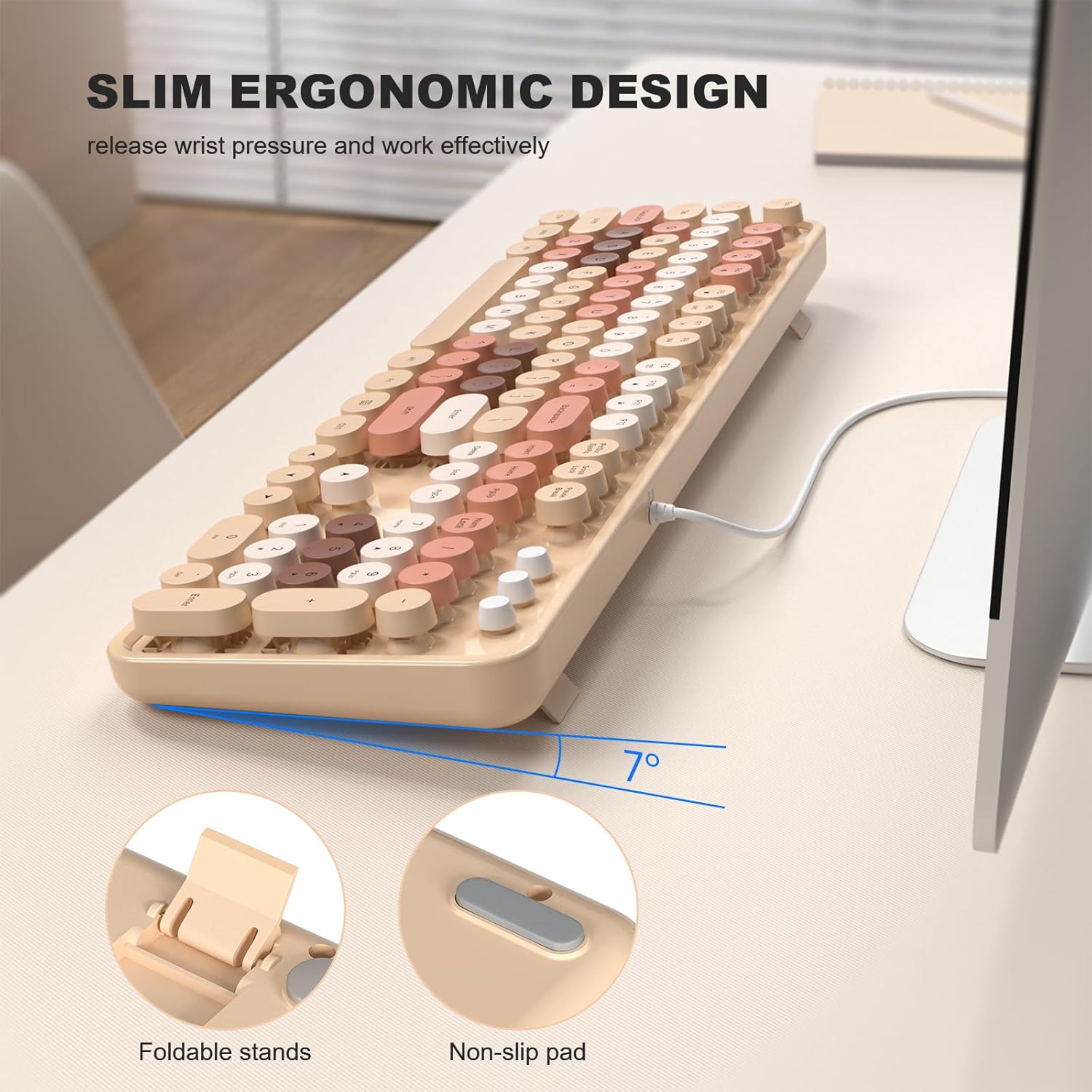 MOFII Wired Keyboard, Full Size USB Keyboard Plug Play, Colorful Retro Round Typewriter Keyboard with Foldable Stands for Windows PC Laptop (Milk Tea Colorful)